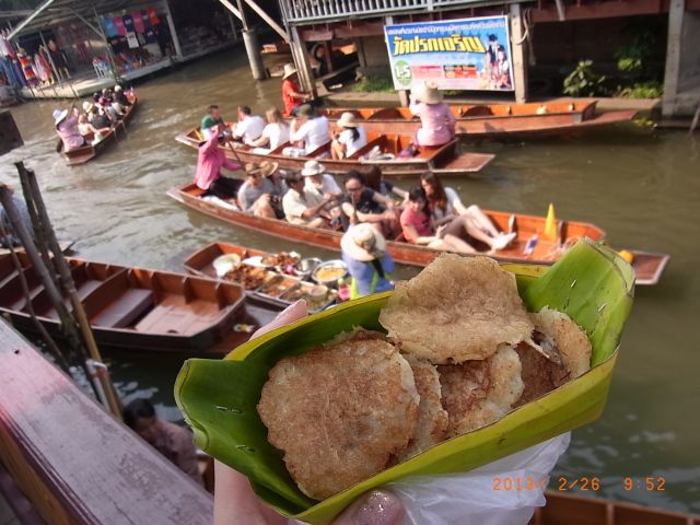 現地では小舟には乗れなかったですが、(一人なので。。)水上マーケットを見ることができ、止まっている船でフルーツやパンケーキを買うことができ、結構楽しめました。