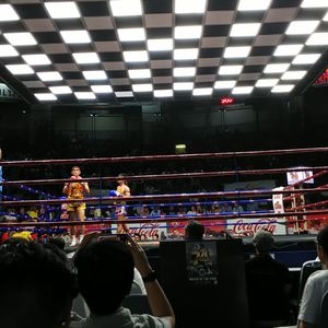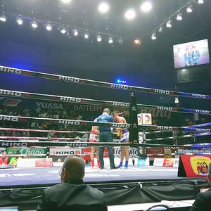 BTSプルンチット駅付近のホテルからタクシーで向かいましたがバンコク名物の大渋滞にはまり到着まで45分を要しました。タクシー利用を検討される方はご注意を。到着するとエントランスに黄色いTシャツを着たスタッフが待機しておりすぐに席まで案内してくれます。席に着いた20時の時点で第3試合の途中。第一印象は"近っ!" リングサイド席なので大迫力でした。メインの第7試合まで観戦し、KOこそ有りませんでしたが試合内容はそれぞれ白熱しており大変満足しました。観戦終了後はスタジアム内を見て回ったりギフトショップでお土産を購入して帰路につきました。