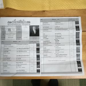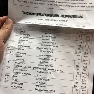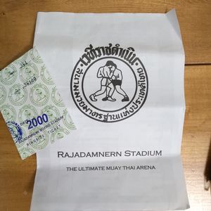 午後5時半にホテルを出発して、ラチャダムヌン・スタジアムに6時に到着。係の人に案内され前から5~6番目の席へ座ると、水を持ってきてくれた。しばらくすると全員が起立してタイ国歌、国王のビデオが流された。試合は6時半から開始された。全部で9試合あったが、自分は5試合が終わった時に帰った。