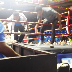 本当のリングサイド最前列で、最高の迫力でした。試合はもちろん、現地の人の後ろの方からの応援がものすごく、つられて興奮してしまいました。KOの瞬間も2回みられました。大満足でした。