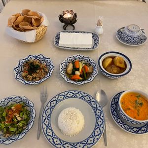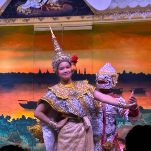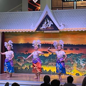 タイ古典舞踏ディナーショーでは、タイ料理を食べながら踊りを見ました。お料理は辛いものが少なく、野菜類が多くて、食べやすくておいしかったです。踊りの方達と写真がとれてよかったです。