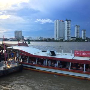 送迎なしで行きました。BTSサパンタクシーン駅2番出口を出て、人が流れる方向のあとに着いて行くと行列のできてる船着場に到着。かなり行列ができていましたが無料シャトルボートに次から次へと人が乗り込み、私達もそのまま乗り込むことができました。かなり混雑しクーラーは効いていないので送迎付きやタクシーで行くと楽チンだと思います。