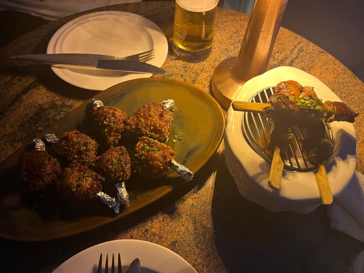 バンコクのルーフトップバーは、これまでにルブアの「スカイバー」とバニヤンツリーの「ヴァーティゴ&ムーンバー」に行ったことがありますが、初めて「レッドスカイバー」に行って来ました。これまでに行ったルーフトップバーは立ち席が基本ですが、レッドスカイはバーに到着後に空いている座席の中から自分で選ぶスタイル。混雑しておらず、落ち着いて座れるのがメリットです。サンセットの時間帯はサンセットが正面に見える席から埋まっていくので、少し早めの時間帯を予約するのがお勧めです。ビール2杯と料理1品のセットを申し込みましたが、夕方でも暑いバンコクでは、キンキンに冷えた生ビールがぴったりでした。また1人1品をメニューからその場で選ぶのですが、フライドチキンは割と量があって美味しく、七輪で出てくる和牛串も美味しかったです。混雑した他のルーフトップバーとは異なり、ゆっくりと夜景を楽しみながらお酒を楽しみたい方にお勧めです。また自分の座席で喫煙可能ですので、愛煙家の方々にお勧めできるかと思います。