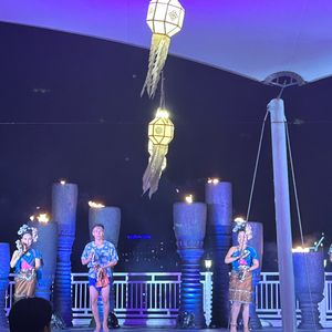 タイの舞踊は内容が変わったのかストーリー制は無くトップページの写真のようなショーはありませんでした。説明には19時〜20時の間で20分(途中20分休憩)20分と40分のショーのように記載がありましたが実際には5分くらいのパフォーマンス(ファイヤーショーなど)を1時間の間に5回ほど行うといったおまけ程度の内容でした。ショーを目当てに行くと少し残念な気持ちになりそうですがタイらしい雰囲気が味わえて初めてのタイ旅行の方などにはとてもおすすめ内容だと思います。食事はシーフード、お肉、お寿司、カレーとメニュー豊富でとても良かったです。デザートもケーキにアイスにクレープとこちらも全部美味しくいただきました。お子様も楽しめるのではないでしょうか。
