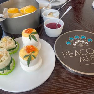 エレベーターで上がったフロントの奥に「ピーコックアレー」があります。最初迷って反対側に行ってしまいました。眺めのいい窓の大きな広い空間でした。席は窓側一番左の、ゴルフ場がよく見える二人掛けテーブルでした。かわいらしい写真映えするセイボリーやスイーツがどんどんたくさん出てきて、乗り切れなくなってしまうくらいでした。もうちょっとテーブルが広いといいかも。スモークサーモンのエッグベネディクトが特においしかった。お店も空いているので気にせずゆっくりできました。食べきれないくらいたくさん出てきて、全部食べてしまったので夕飯もいらないくらいお腹いっぱいになりました。