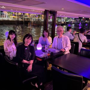 イギリス、日本、インドと多国籍で乗船、ディナーをブッフェ形式で食べて歌や踊りを楽しめます。メンバー構成によりますが老人向けの音楽で盛り上がりました。19時乗船でライトアップが綺麗でした。