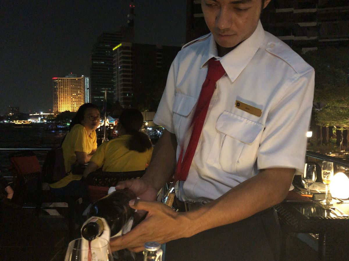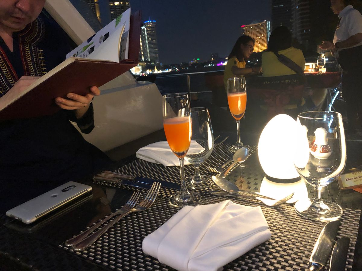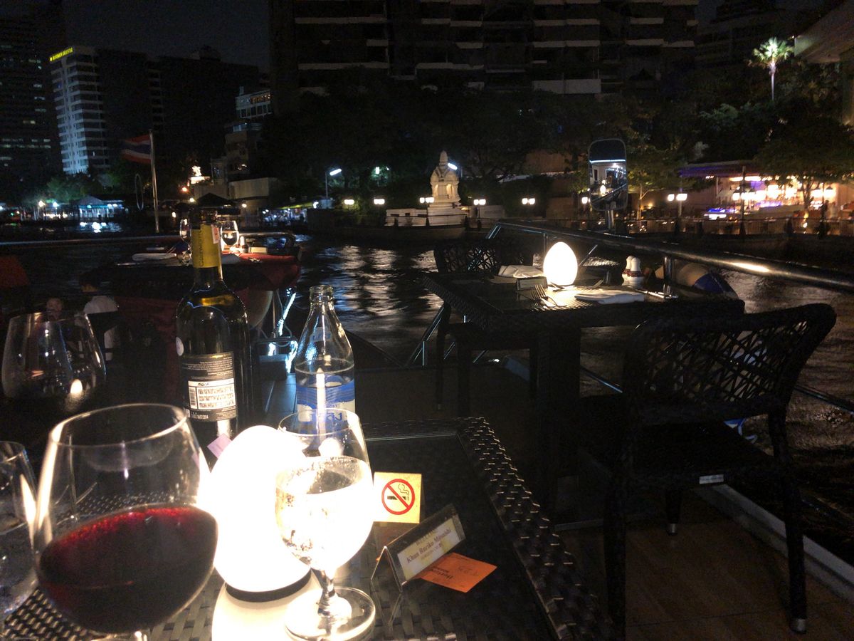 乗船前はリバーサイドバーで飲み物を楽しみながら待つことができます。バンコクならではの夜景を楽しみながら、比較的小さい船でクルーズをします。着席でのんびりしながら食事を楽しむことができます。お食事はおいしいタイ料理で、量も十分で食べきれないほどです。リラックスした良い時間を過ごすことができました。
