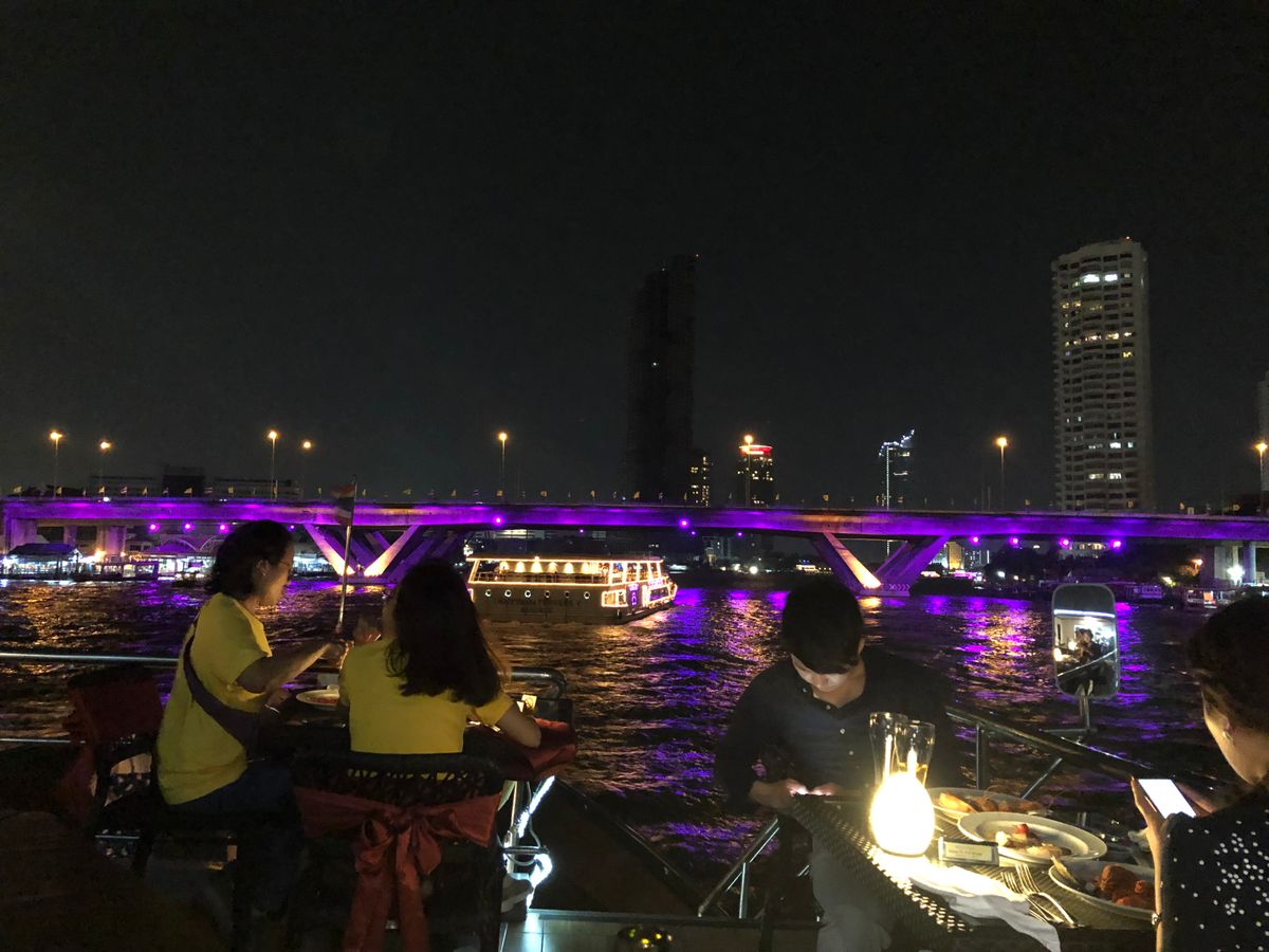 バンコクの夜の景色をクルーズ船で見る体験はまさに非日常の世界!ディナーを楽しみながら素敵な時間が過ごせました。一点だけ、、、船が二種類ありますがこの船にて異なる雰囲気でした。大きさも違うし、やはり大きな船の方が、より非日常的でゴージャスな気分になれたと思います。私の乗った方は少し小さい方でした。