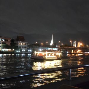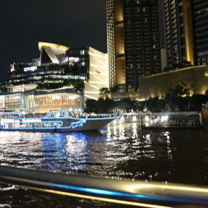 私たちは、2階の窓側でしたが、ワットアルンなどは、全貌は窓枠もあるので、座席からは見えず、屋外のデッキに出る必要があります。またライトアップされた寺院だけでなく、川沿いのショッピングモールのネオン、橋などは綺麗でした。