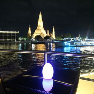 デッキでチャオプラヤー川の風を浴びながら、お洒落な音楽と共に見るライトアップは格別で、特別な時間を過ごすことができました。特に、昼間それぞれの寺院を観光していたので、夜のライトアップされた様子はなおらさ格別に感じました。