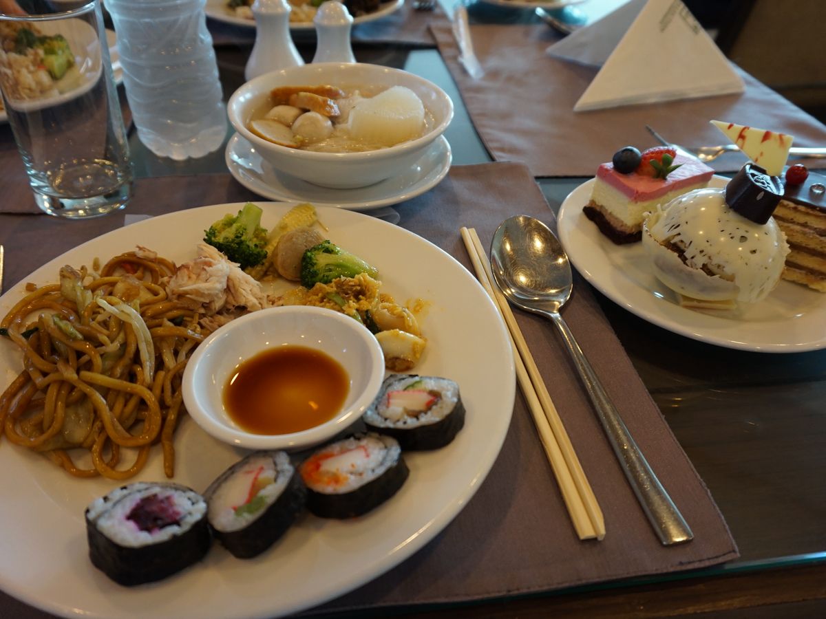 お昼ご飯のビュッフェも豪華でタイ料理も辛さを控えて作ってあり美味しく頂けました。またデザートのケーキの種類も豊富にありテンションが上がりました。