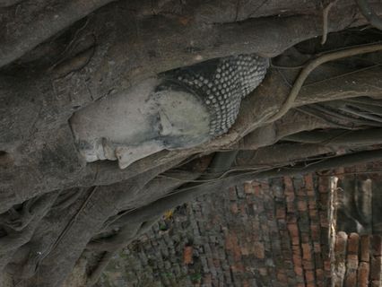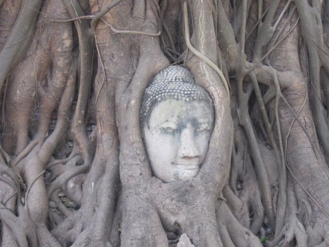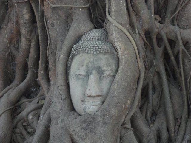 マハタートの木に抱かれた仏の顔 だんだん木に覆われていくので10年後にはもっと顔が狭くなるでしょう…と聞きました。