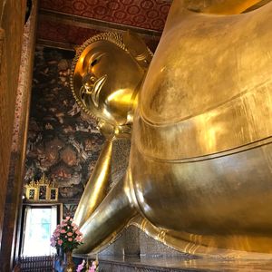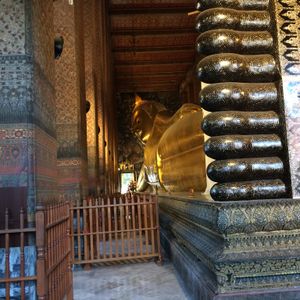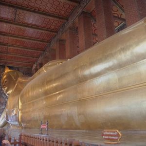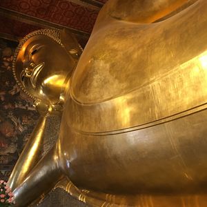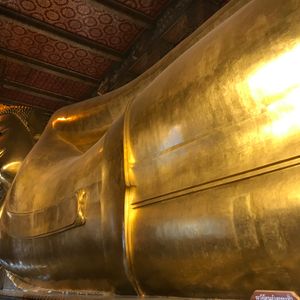 足裏の部分に足場がかかっていて近くで見れなかったのは残念でしたが、それ以外は近くで見学できたのでよかったです。広い敷地内を見学した後、暑さにバテた体に冷たいおしぼりとお水を頂けたのは嬉しかったです。ごみは回収されませんのでゴミ袋持参ですね。市内観光終了後は宝石店へ案内されましたがすぐ帰る人たち私達を含め3組はガイドさんの待つ集合場所へ。ガイドさんが送迎の車の運転手さんへ宿泊するホテル名と降ろす順番ごとに席の案内をしてくださりガイドさんとはそこでお別れ。まず1組目が降り次は私達のはずが、3組目をホテル駐車場で降ろしたあと動く気配なしでしばらく放置状態。私たちがホテル名を言うと、ホテル中に入って確認しに行き、だいぶ経ってからの出発となりました。結局私達の泊まるホテルは1組目と3組目の間にあるホテルでしたが、道も渋滞しており、遠回りになりホテルに着くのが宝石店出発から1時間半後とかなり遅くなりました。午後からはフりータイムだったのでよかったですが、今後タイへ旅行される方は時間には余裕を持ったプランを立てることをお勧めします。あと熱さ対策も忘れずに。