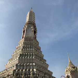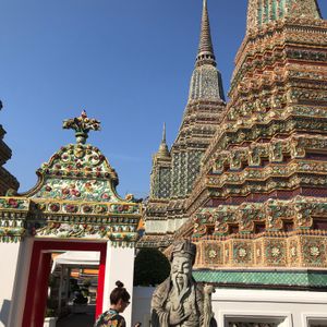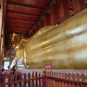 夜行便でタイへ早朝に到着しました。入国審査がスムーズにでき、集合時間まで時間があったので両替所にいきました。お迎えがある(4番出口付近)に向かい、名前が書かれた紙がぶら下がっており、係員の人に声をかけたら5分後くらいに車が到着。綺麗な専用車に私たち2人だけ乗車。飛行機で疲れた体には乗り安全運転かつ心地がよい高級感あるシートで癒されました。その後、市内観光集合場所のアノーマホテルへ。ホテルでの待ち時間はトイレで身支度等をし、1時間後くらいに催行会社のガイドと現地発のツアー客と合流して3大寺院巡りをします。まずはワットアルンに向いました。船着場から船に乗り、数分後には足場も取り外され大変きれいな状態になったワットアルンへ到着。ガイドさんの説明後、自由時間にて急階段を途中まで登り、上から見える川や景色を満喫しました。近くには小さなお土産屋さんがあったので買い物もすることが出来ました。その後、車に乗り込みワットポーや王宮に行きましたが、とにかくすごい観光客だらけでした。個人で行く場合、入場の手続きが大変だなと痛感したのでツアーに申し込んで良かったと思いました。ガイドさんの日本語は聞き取りやすく丁寧な案内や、写真スポットを教えてくれたり、撮影もしてくださり親切に対応してもらえて大変助かりました。ワットポーでは見学する際に靴を脱ぐのですが盗難が心配だったので袋の中に入れ持ち運びました。金色に輝く涅槃造。とても綺麗でした。