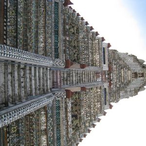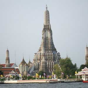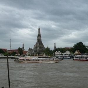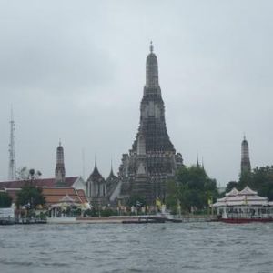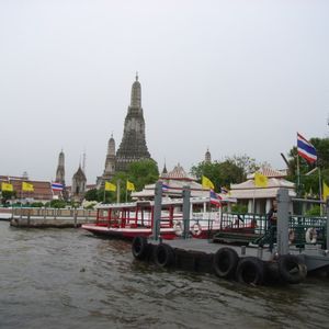 フェリーでワット・アルンに向かうときはワクワクしました。前日が雨で、この日は曇りでした。朝日があたっていれば、まさしく暁の寺だったのでしょうが。