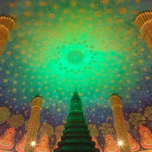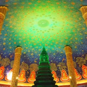 最初に訪れたのは大理石のお寺、ワットソートン。ここでタイのお寺でのお参りの仕方や自分の誕生曜日の色や仏像の説明があり、仏像に金箔を貼ったりもできました。