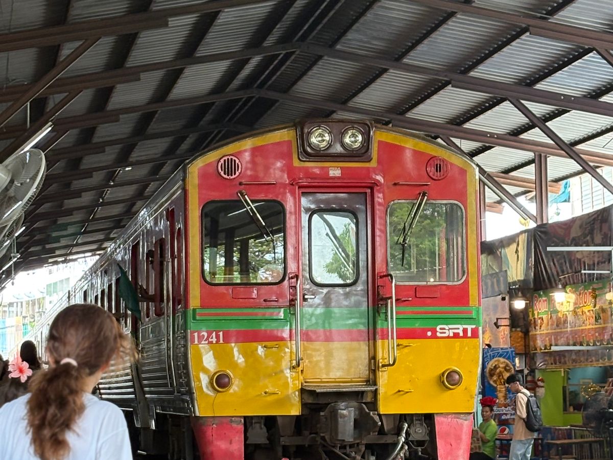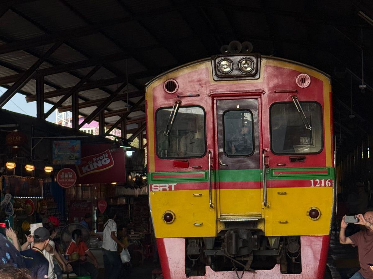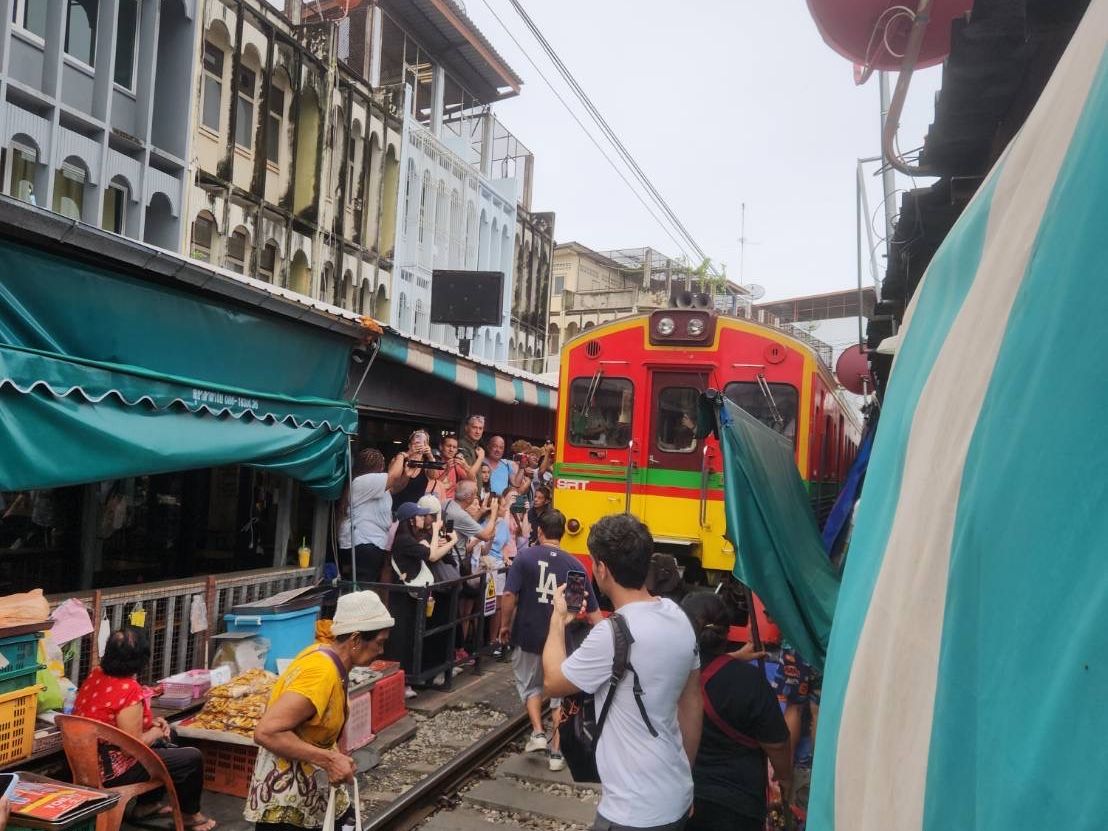 メークロン市場では、カフェの特等席で目の前を通り過ぎる電車を見る事ができます。