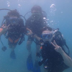 ダイビング初体験の四人組で、楽しみと不安でいっぱいでしたが、インストラクターはみんな優しくて面白い方々で緊張もすぐにほぐれました。ダイブの前半はインストラクターの方々が手やタンク握って誘導し、後半の慣れ始めた頃には自分たちで泳ぐチャンスも少しありました。正直もう少しダイブ続けたかったなーって思えるくらい楽しかったです。