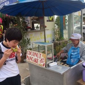 自由散策後の集合場所には「ココナッツパンケーキ」の屋台が出ており、ガイドさんが薦めるので食べてみました。一皿(葉?)40バーツです。これがおいしい!絶対にオススメです!火を通しているので、子供でも安心して食べられると思います。タイの食事が合わずに空腹続きだった息子が何度も買って食べていました。