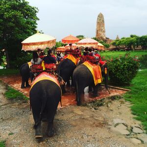 その後、ワットヤイチャイモンコン、ワットロカスタヤ、ワットマハタート、ワットプラシーサンペット(ガイドさんがその都度遺跡の説明をしてくれます)を観光し、楽しみにしていた象乗り体験です。思っていたより揺れもあり、椅子にしがみついていないと不安なほどでしたが、可愛い象さんの背中に揺られながら風景を眺められ、とても楽しい時間が過ごせました。