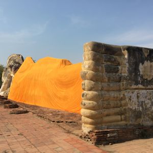 ここの涅槃仏はアユタヤ最大のもので訪れたときは布がなく、石はだが自然なグレレー色で入り交じっていて、かえって穏やかな雰囲気であった。足の裏の高さだけでも3m以上あるだろうか。周りの建築物はほとんど残ってない。遺構が点在するのみである。タイはビルマとの24回にも及ぶ永く苦しい戦争がつづき遺跡もかなり破壊されたという。戦いには象も使われた時代があったと聞く。人と象との関わりを考えるとき、宮沢賢治の「オツベルと象」を思い出していた。