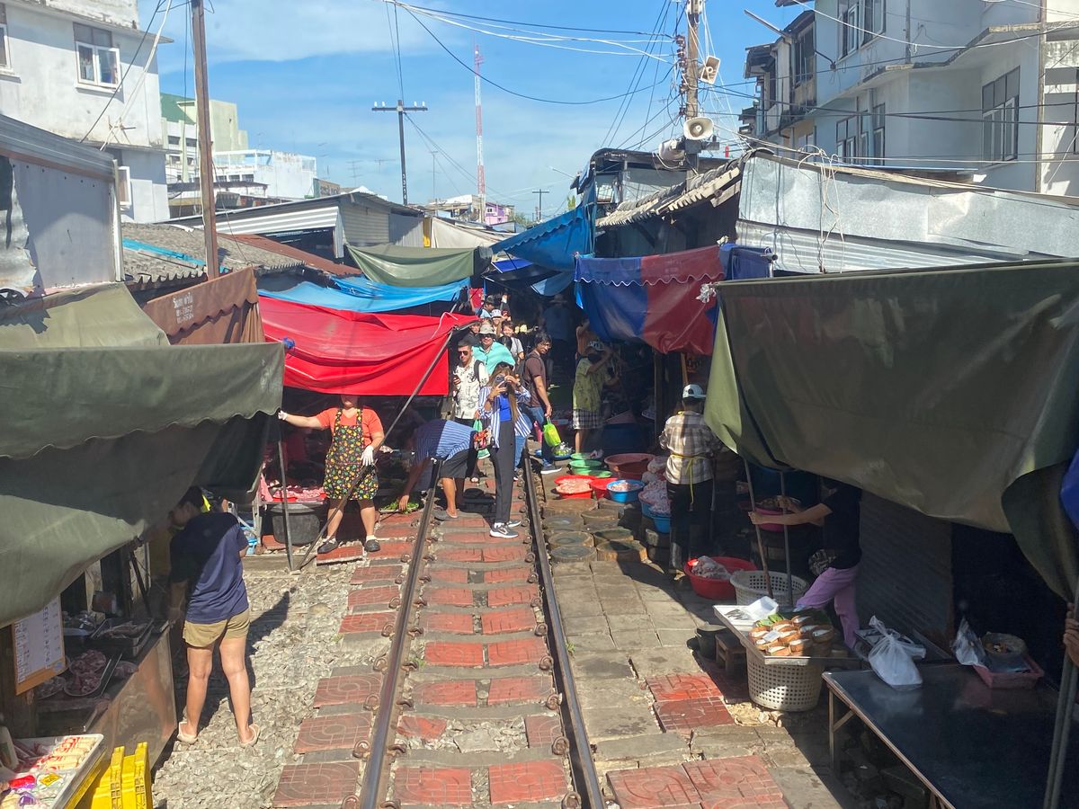 メイクーロン鉄道市場へご案内。市場を散策したあといよいよ、鉄道が市場に到着、本当にギリギリを鉄道が通貨しました!迫力満点。