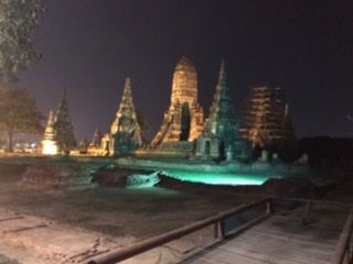 バンコク市内を午後出発し、2回目の遺跡群へ!観光客も少なく・涼しい、ライトアップした遺跡は大変美しかった。 ガイドは、流暢な日本語で説明!エビ三昧の食事は、美味しく頂きました。