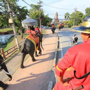 天気が良くて、日差しがきつかったです。ガイドさんは片言ですが、とでもわかりやすく案内してくれました。それぞれ自由時間もあって、ゆっくり見て回れました。象乗りも思ったより遠くまで乗せてくれました。チップは象使いのお兄さんへ。小象へ餌やりもさせてもらいました。記念撮影は別料金です。夕食はワンプレートにすべてが乗っていて、男性には物足りない量のようでした。夕食後のライトアップ頃にはあちこちまわってぐったりでした。とにかくいっぺんにアユタヤを満喫できるいいツアーだと思います。