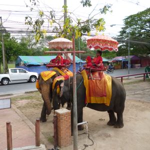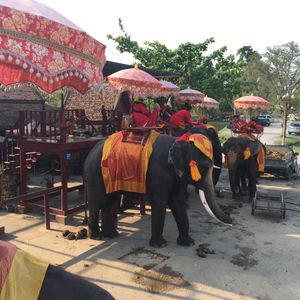 一人のみの参加のためか時間が余り自由時間が多かった気がします。象は300バーツで約10分乗りました。降りるとチップを求めらたので20B渡しました。事前にガイドさんに確認したところ、渡す必要はないが渡す場合20Bで良いとのことでした。夕食はアユタヤ内の食堂のような所で簡単な食事で飲み物のみ別料金でした。ライトアップされた遺跡2箇所を3輪自転車でまわるのも楽しめました。