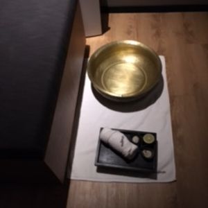 施術室に通され紙パンツに履き替え、バスローブを羽織りお着替えをして足を洗ってくれるのですが、ハーブソルトに生のカフィラムを絞って足湯に入れてくれます☆カフィラムがすごくいい香りです。