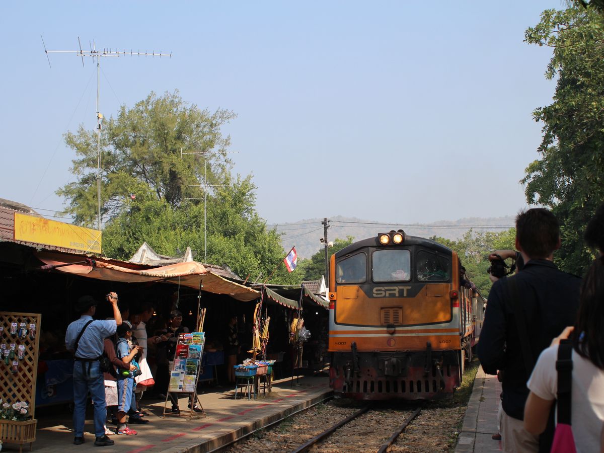 タムカセ駅に戻るが列車が2時間近く遅れ、乗車は4時前になる。2駅だけ列車に乗車し車でバンコクに戻る。帰着が2時間遅れの19時30分になったが、ホテルまで送ってもらい、無事ツアーを終えました。列車遅れのトラブルがありましたが、ガイドさんは臨機応変に対応して下さり楽しいツアーになりました。時々遅れが出るようなので夜の予定は余裕をもって組まれることをお勧めします。