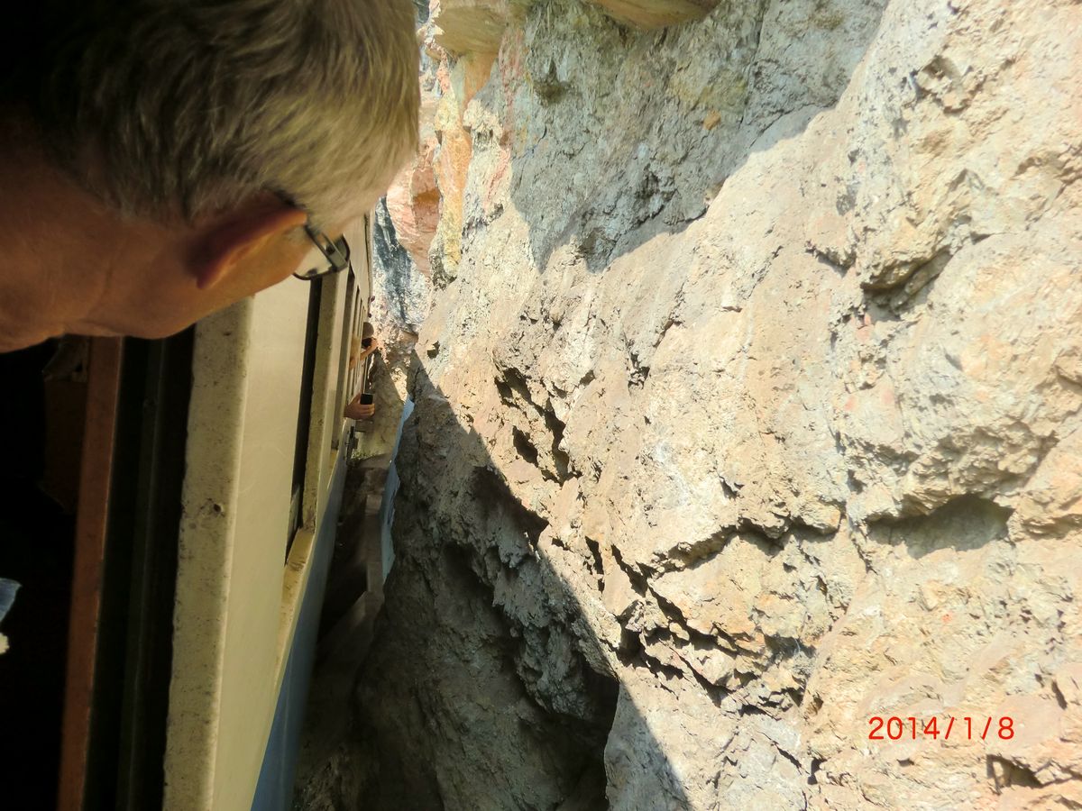 橋での自由時間は15分程度しかなかったので、もう少しゆっくりしたいですね。列車の到着時間がはっきりすれば長い時間ホームで待たなくて済んだのに‥。列車の座席は座布団がないので、少しガマンしましょう。途中の風景は田園風景ですが、ツアーの目玉の崖っぷちの走行は景色が良かった。