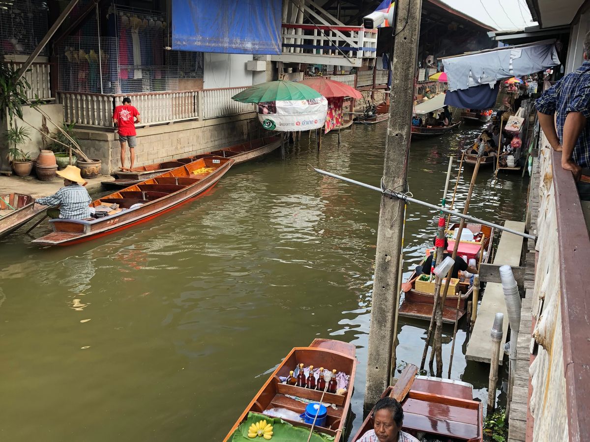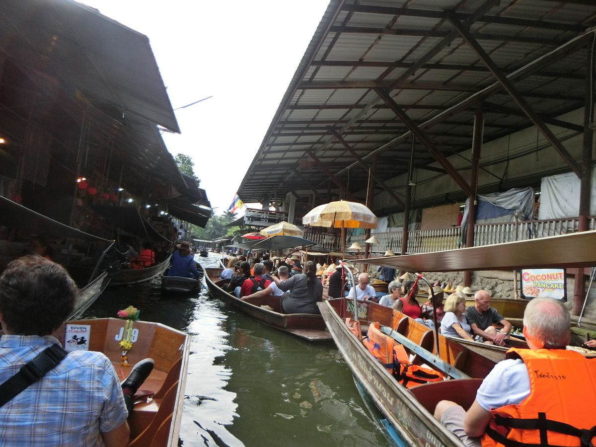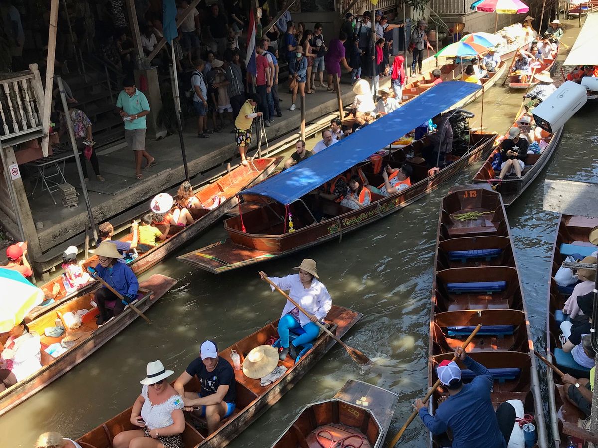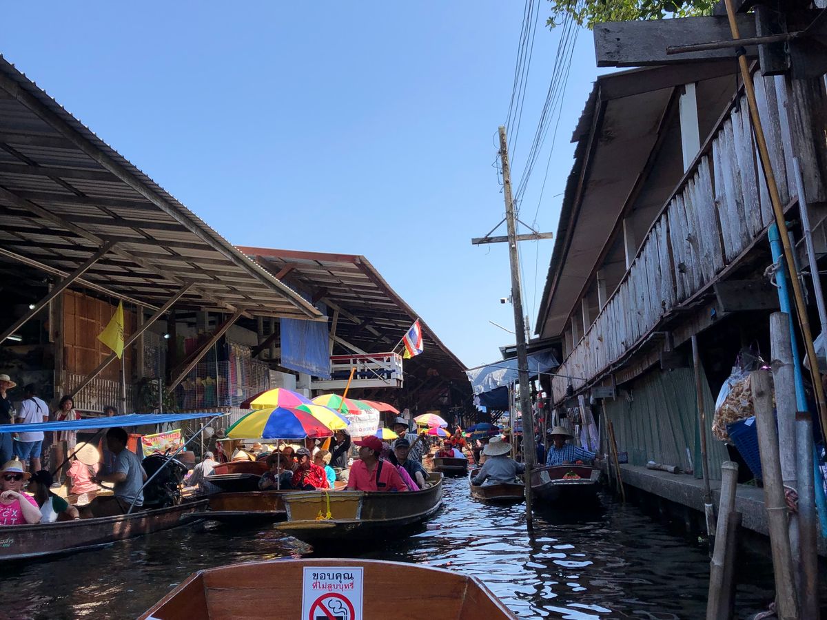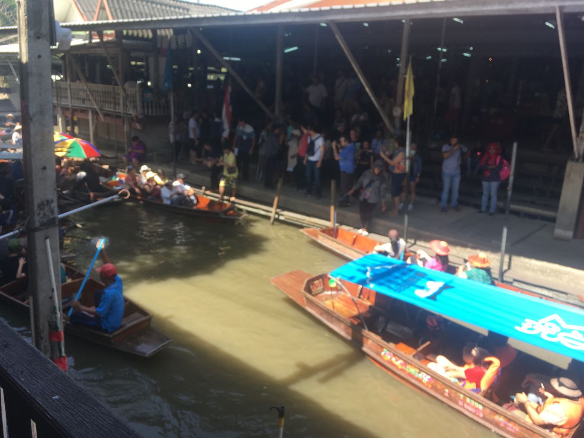 オプションの手漕ぎボートは大混雑で、お店を眺める程度でしたが、水上ボートは猛スピードでスリル満点のアトラクションでした。GWで沢山の観光バス、観光客がいましたが、ガイドさんがタイミングよく案内してくださったので、待ち時間などもあまりなく、快適に観光できました。私たちを含んで3組のツアーでしたが、帰りはもうひと組の参加者の方とサイアムスクエアで降ろして頂けたので、ホテルに戻るよりも効率的に活動できました。