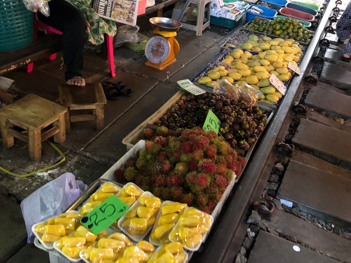 線路市場は凄い人で電車がくる時間にはベストポジションを奪い合うような雰囲気ですが、日本ではありえない光景でした。待っている間にマンゴなどを食べれますし、雑貨も値段付きで売っていますし、ナイトマーケット位の値段でした。