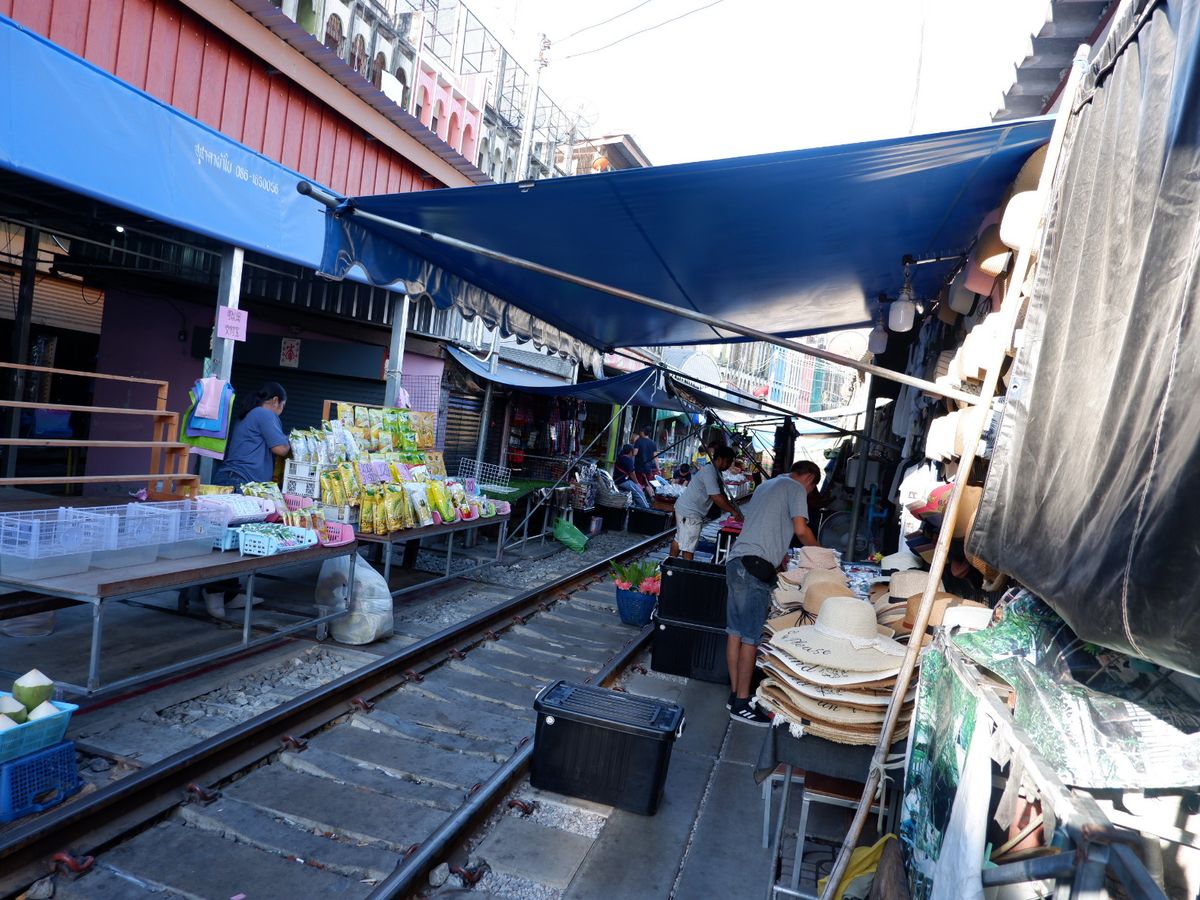 朝6時半に迎えが来て、まず線路市場に向かいました。現地に着くと、ガイドさんから「このあたりで見学します」と指示がありましたが、その場所は人混みがなくてゆったりしているものの、線路には商品を広げておらず、店をたたむ様子は見られない感じの場所でした。電車がくるまでかなり時間があったので、線路の上を歩きながら買い物が楽しめました。ドライマンゴーや生のフルーツもたくさん売っていました。店がひしめく中心部は身動きが取れないほどの観光客の数で、ガイドさんに言われた場所に戻れないままに電車が到着。私たちはたまたま目の前で電車の写真を撮ることができましたが、人混みの中でうまく場所が取れないと、写真どころではないほど混んでいました。