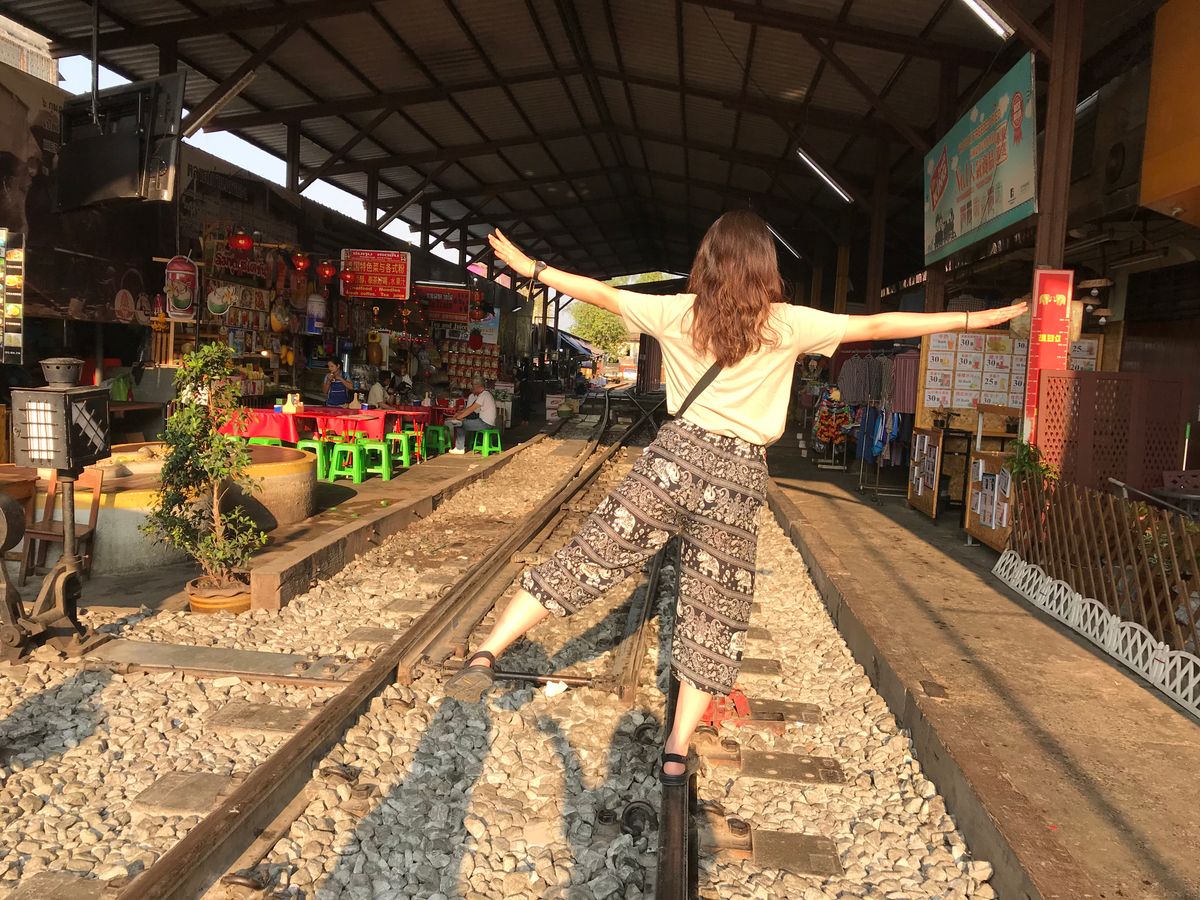 線路の上を歩き買い物をする