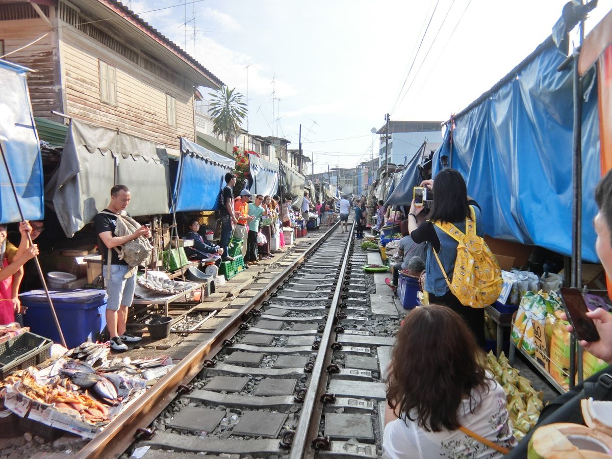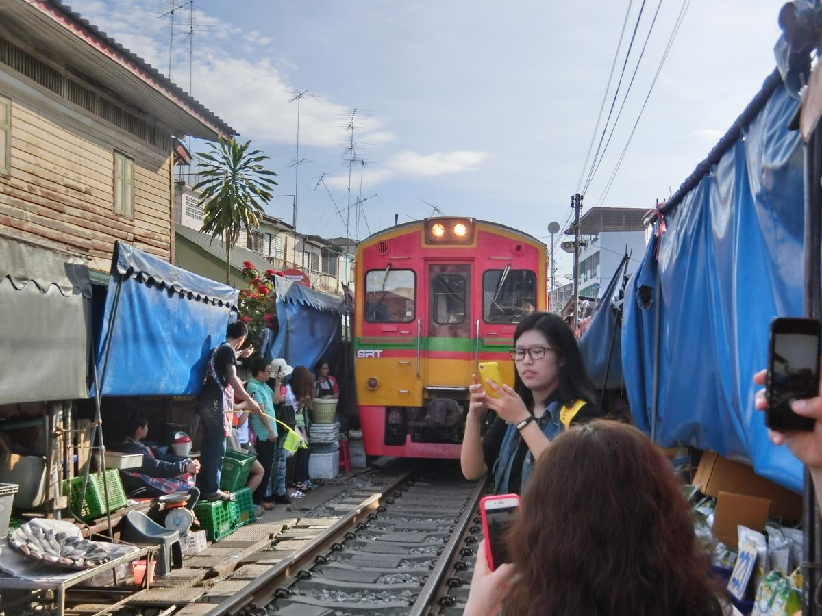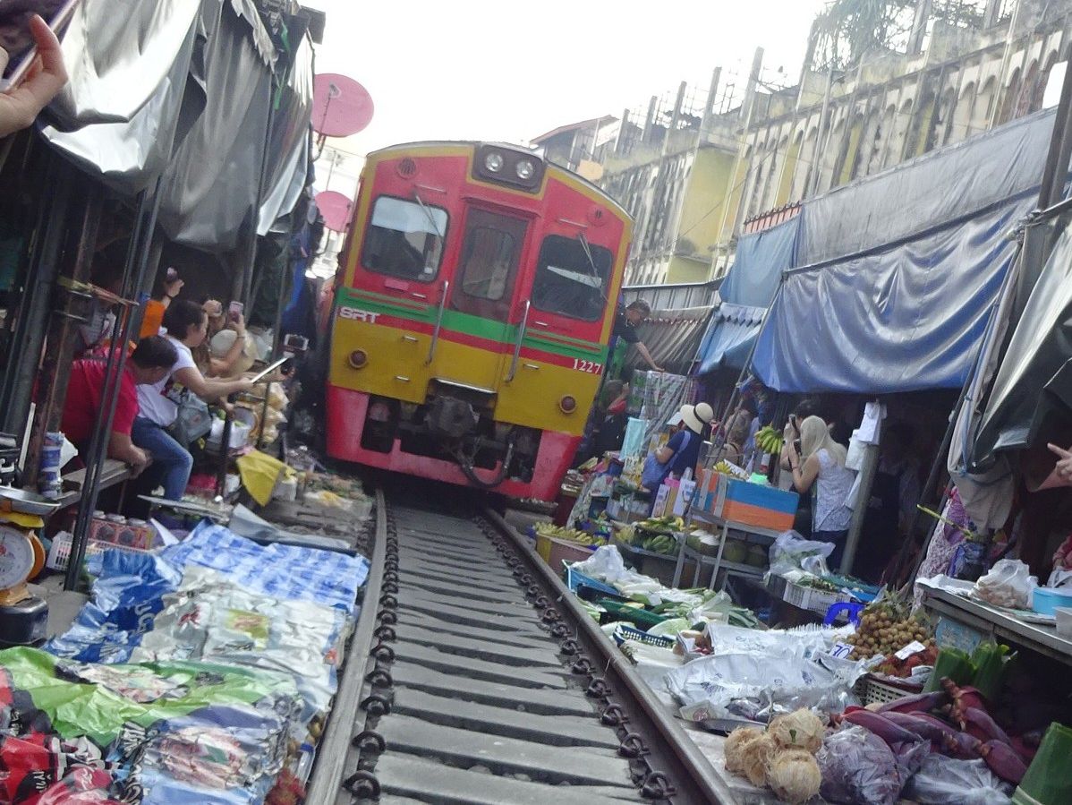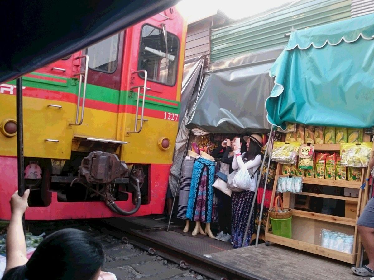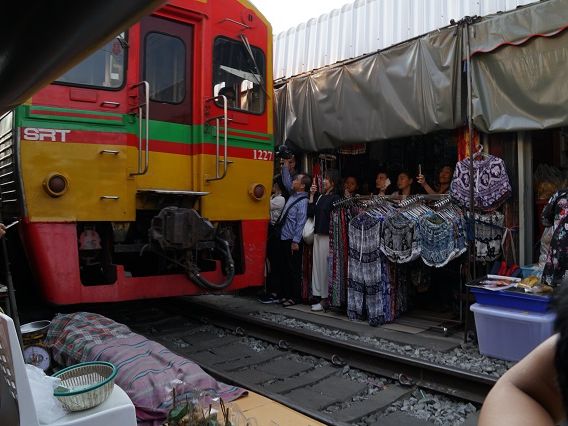 メークロン線路市場は日本では到底考えられないような一般人向けの市場で、道路と線路が交差する踏切から市場に入いります。電車が近づいてきても、この踏切は観光客で一杯で、警備員が警笛を鳴らして後ろに下がらせても、すぐに前に出てきて危ないです。電車はとてもゆっくり徐行して入ってきます。店の人は商品を移動するわけではなく、オーニングをたたむだけですが、一部の商品は電車に当たっておりました。