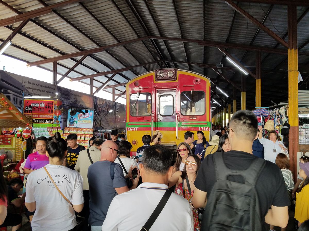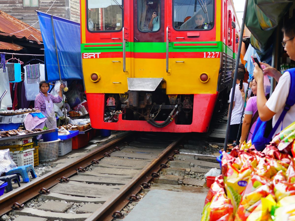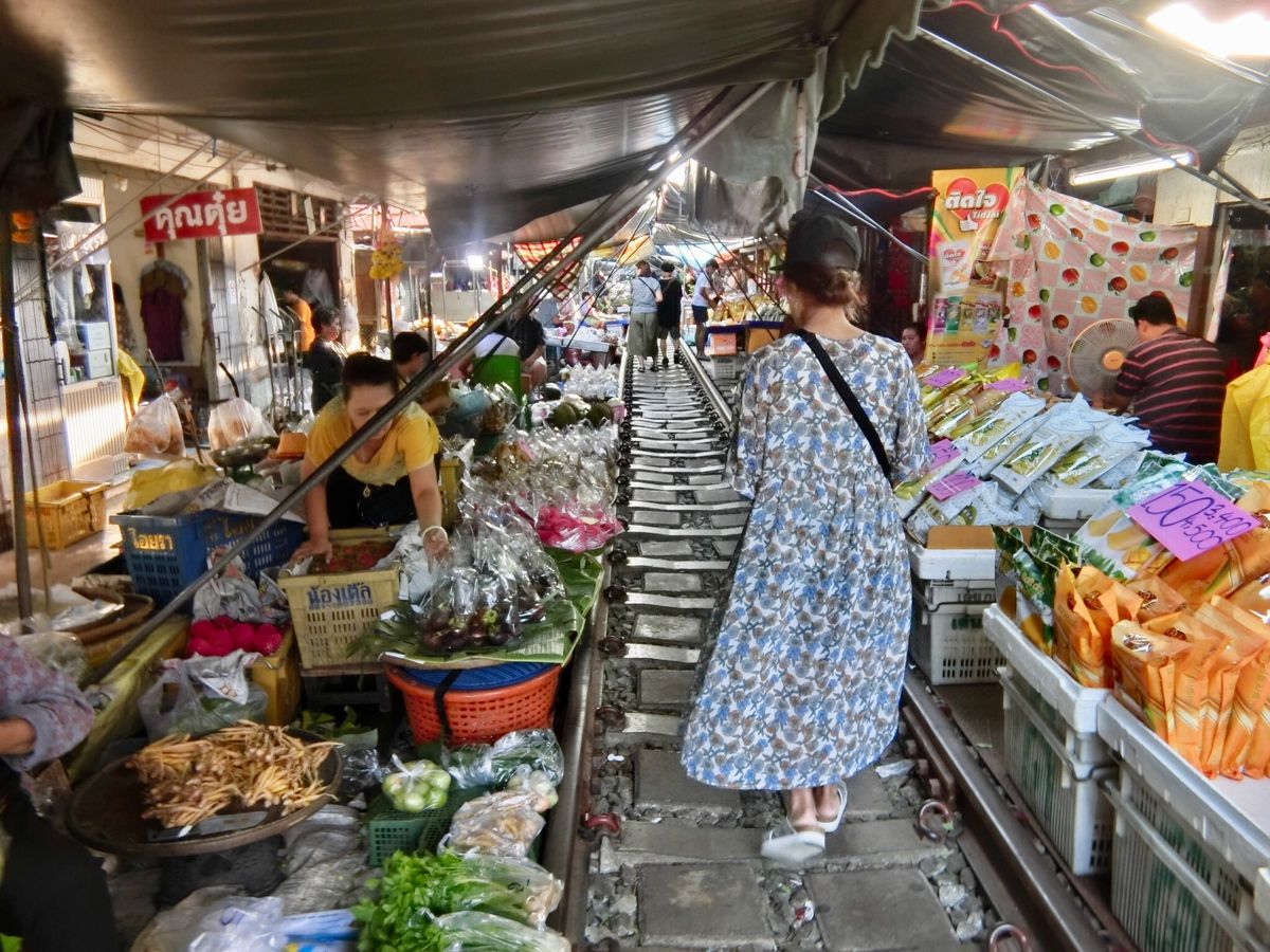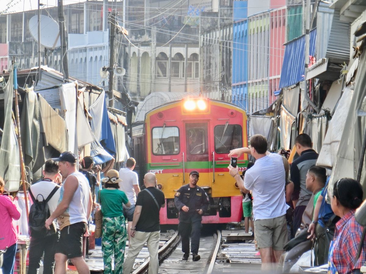 メークロン線路市場は日本では到底考えられないような一般人向けの市場で、道路と線路が交差する踏切から市場に入いります。電車が近づいてきても、この踏切は観光客で一杯で、警備員が警笛を鳴らして後ろに下がらせても、すぐに前に出てきて危ないです。電車はとてもゆっくり徐行して入ってきます。店の人は商品を移動するわけではなく、オーニングをたたむだけですが、一部の商品は電車に当たっておりました。