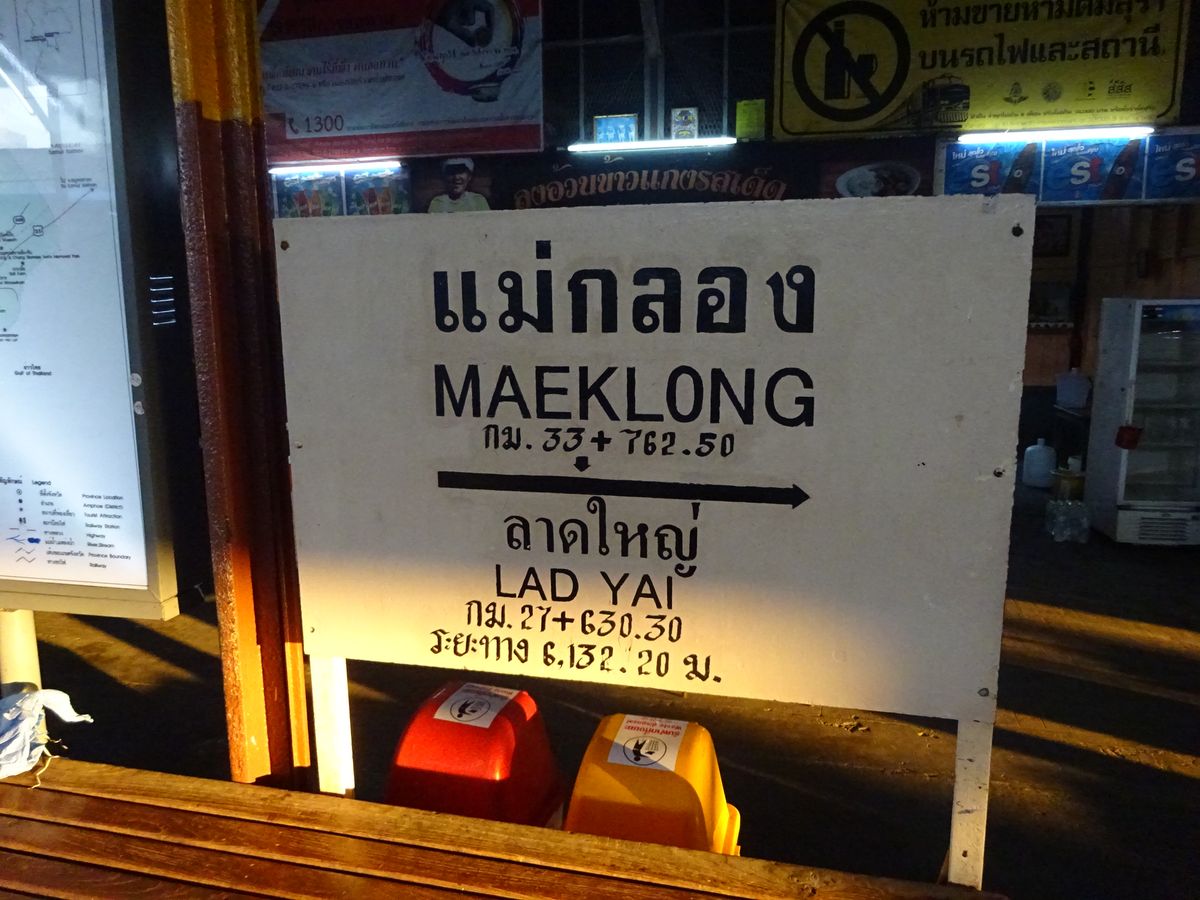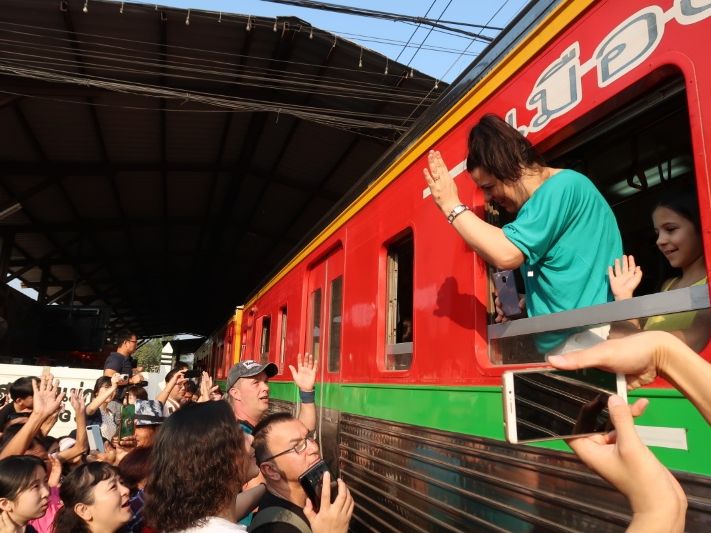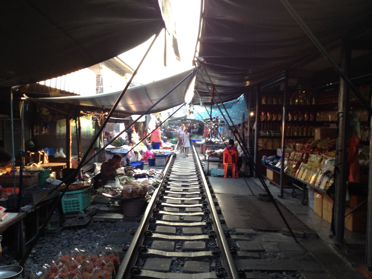 メークローン市場では直前まで線路の上でお店が営業していて、「本当に電車通るの?」と思っていたら、あっという間に片付きすぐに電車が来ました。電車はお店にぶつかるんじゃないかと思う距離を通り、写真もスレスレのところで撮ることができました!!日本じゃ考えられない光景でした。