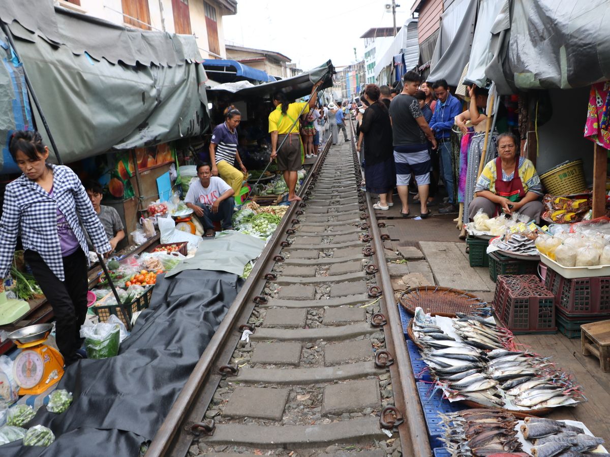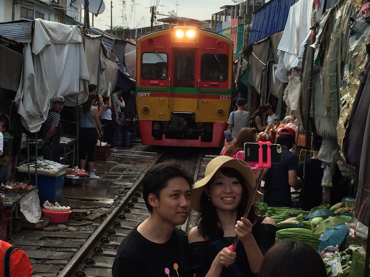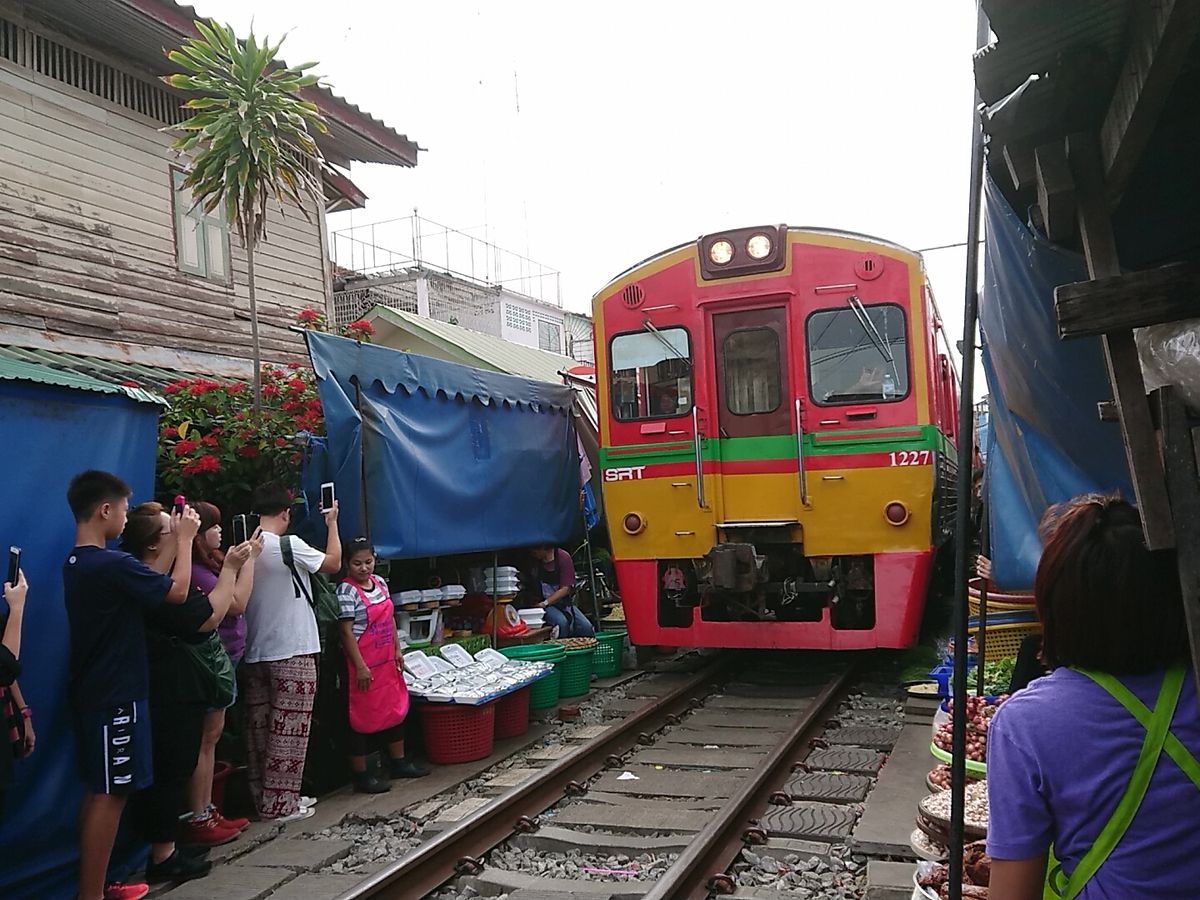 メークロン市場についてはネットや本で知っていましたが、実際に見てみると、汽車との距離が想像以上に近く、迫力がありました。お店の開閉の手際もとても良い事に驚きました。