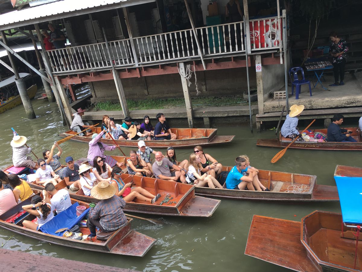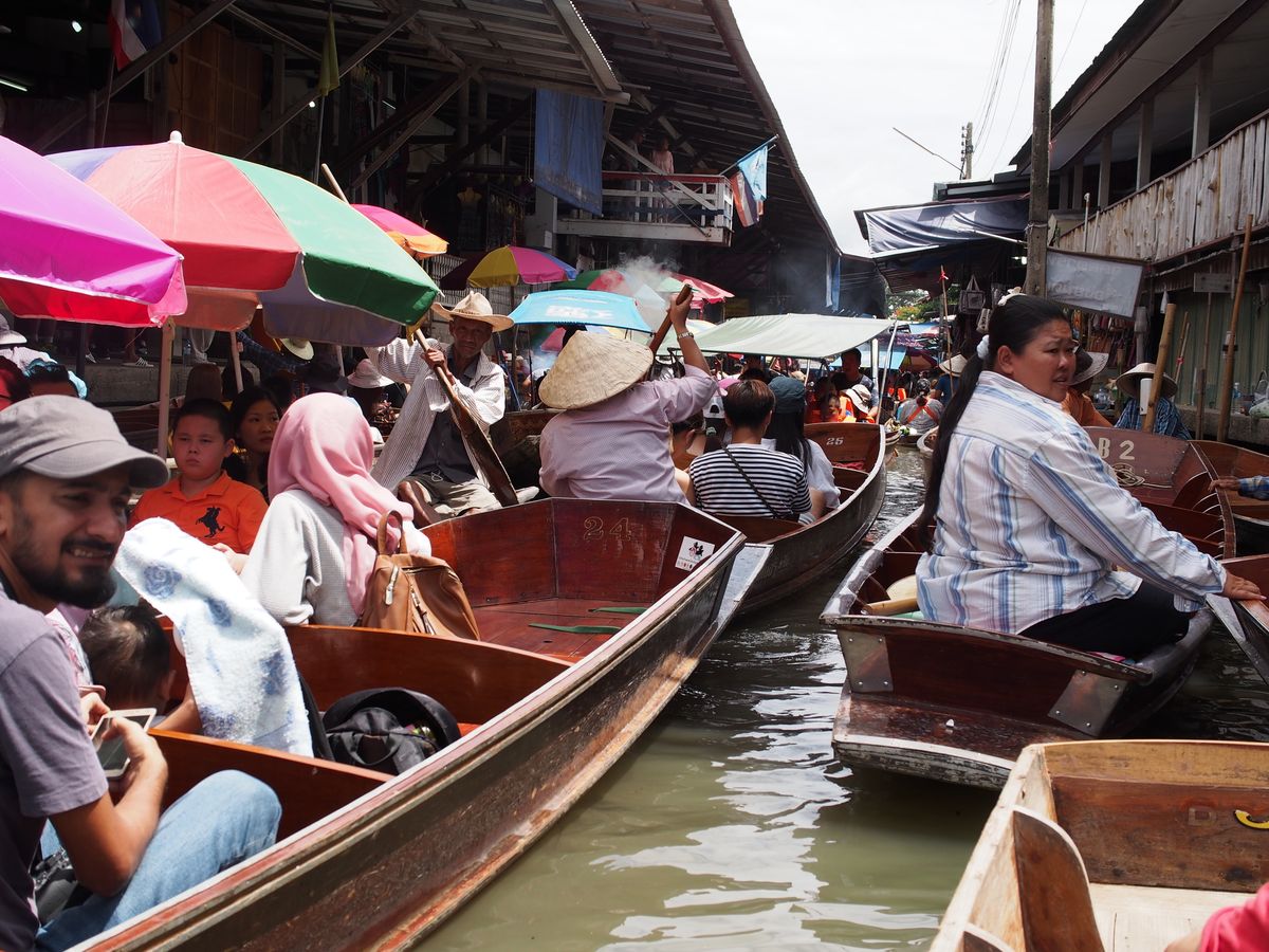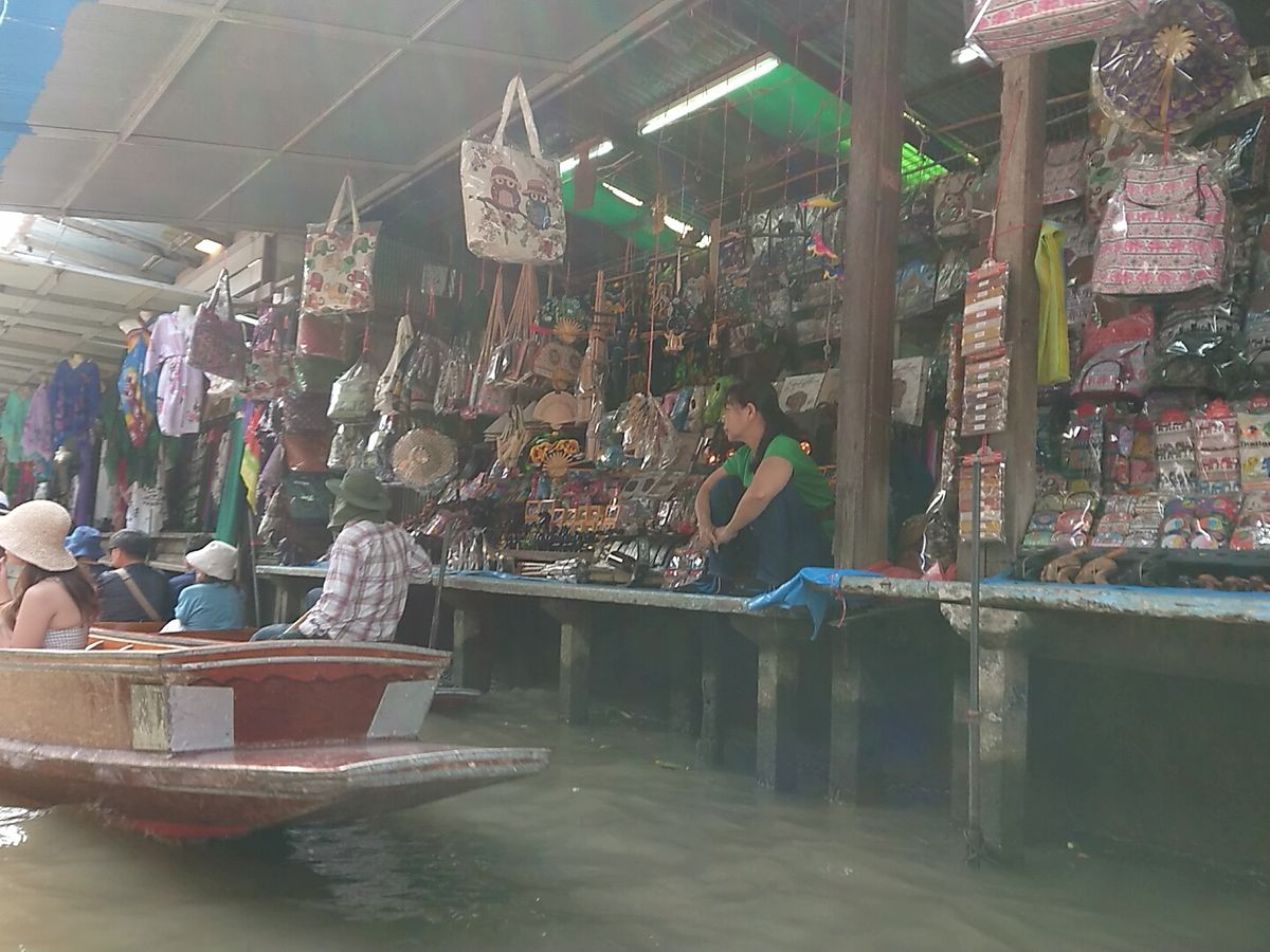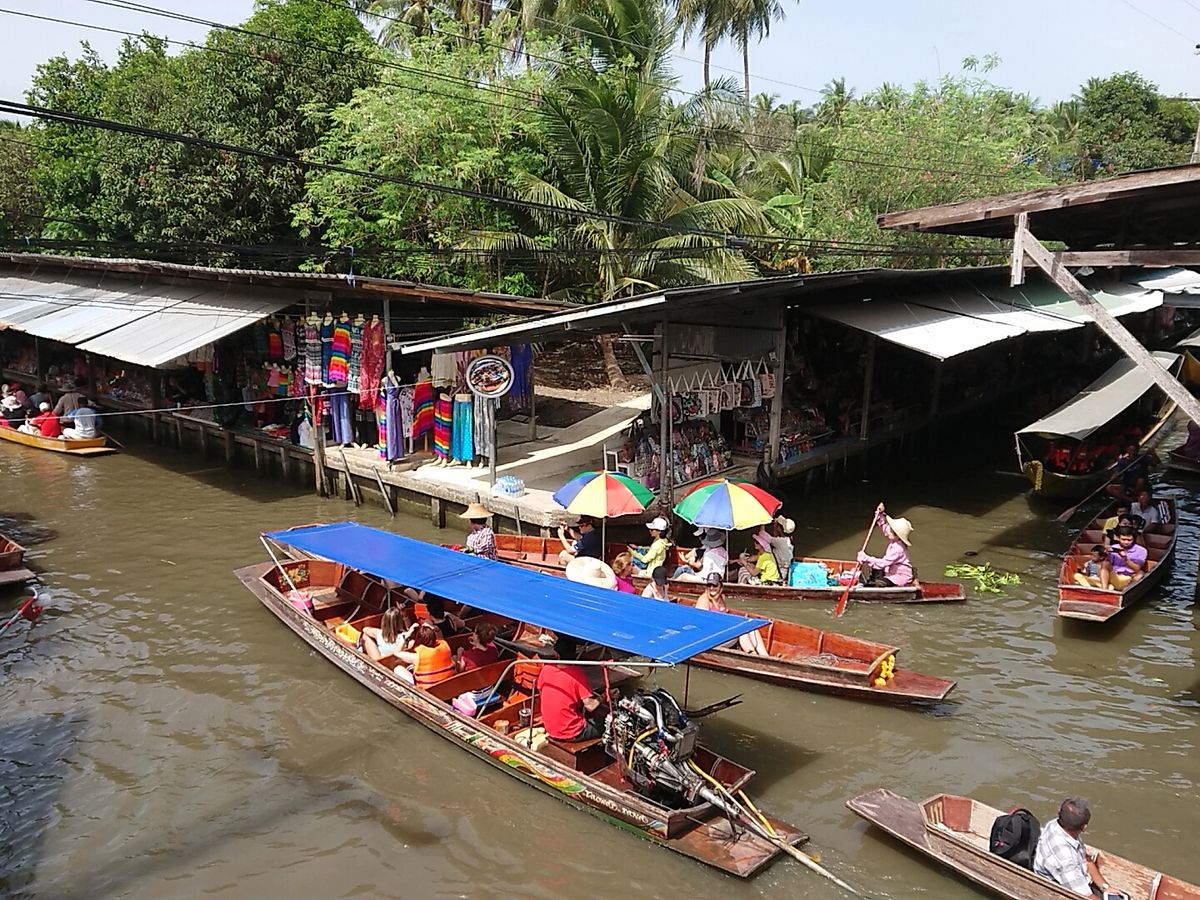 バンコクより朝から水上マーケットまで移動。5月GWでしたが朝から強い陽射しで大変でした。帽子は必要!水上マーケットは、ボートにのって水路を走り回る感じでまぁ一回体験すれば良いかと思います。それからバンコク経由(昼食)アユタヤへ、移動時間が長いので疲れますが、アユタヤではガイドさんの丁寧な説明や像乗り体験は面白かったです。時期にもよりますが暑さには注意です。