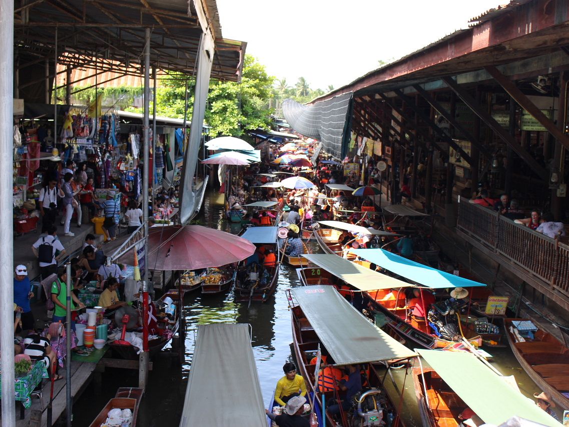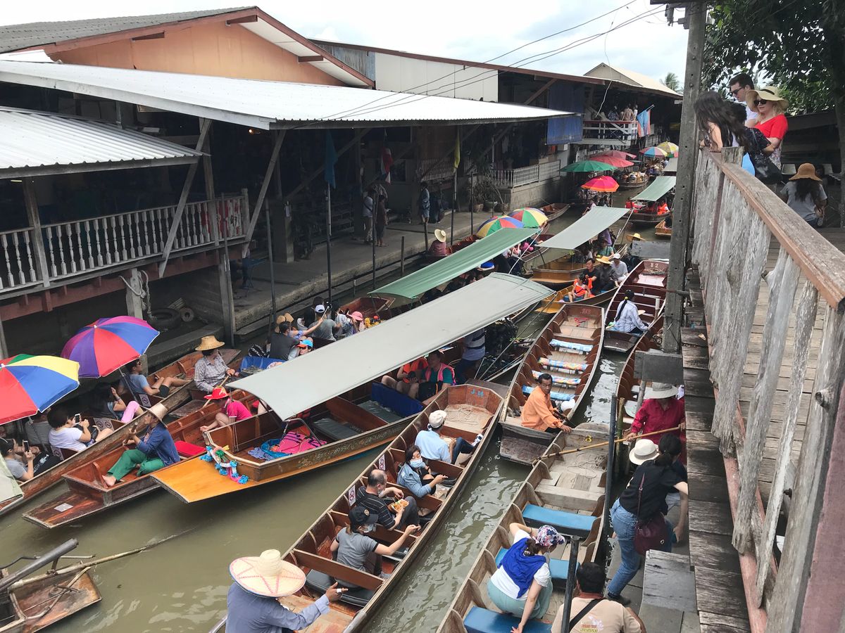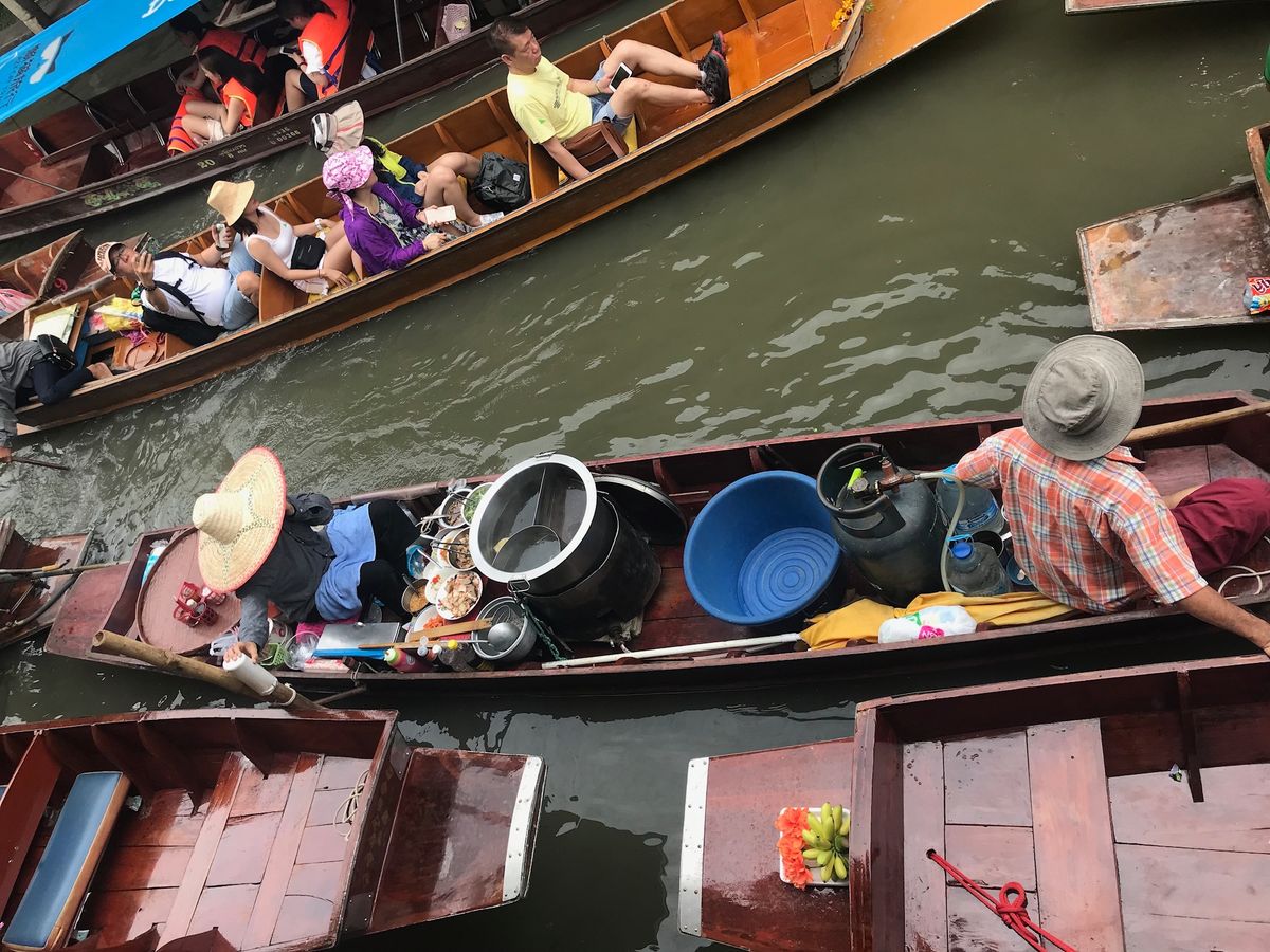 マーケットは本当にタイって感じ。狭い混雑生物いっぱいで、買い物する勇気はなかったです。側のトイレの使用に5バーツ払うのもタイらしい。列車がくるとみんなが一斉にカメラを構えるのですごい事に。日本にはない光景ですね。水上マーケットは買い物するとゆうより見る感じ。移動で乗るボートはハイスピードです。昼食のラーメン店は店もトイレもローカル感満載。良くない意味でですが。いろいろ一度は体験も人生勉強になるかもです。