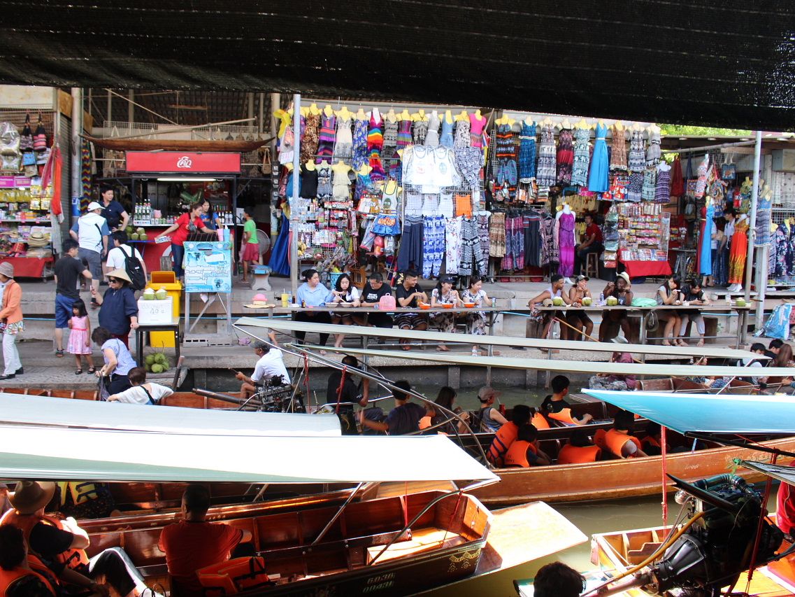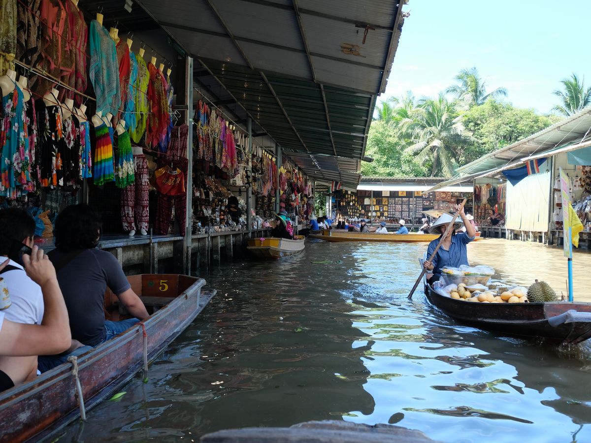 水上マーケットは、車で船乗り場へ行きそこから早いボートで水上マーケットまで行きました。私は手漕ぎボートにも乗りました。ただ、買わないのに何度も店先で止まるのはやめてほしいなっと思いました。川沿い以外にもたくさんお店があったので、そこはもう少しみたかった気がします。