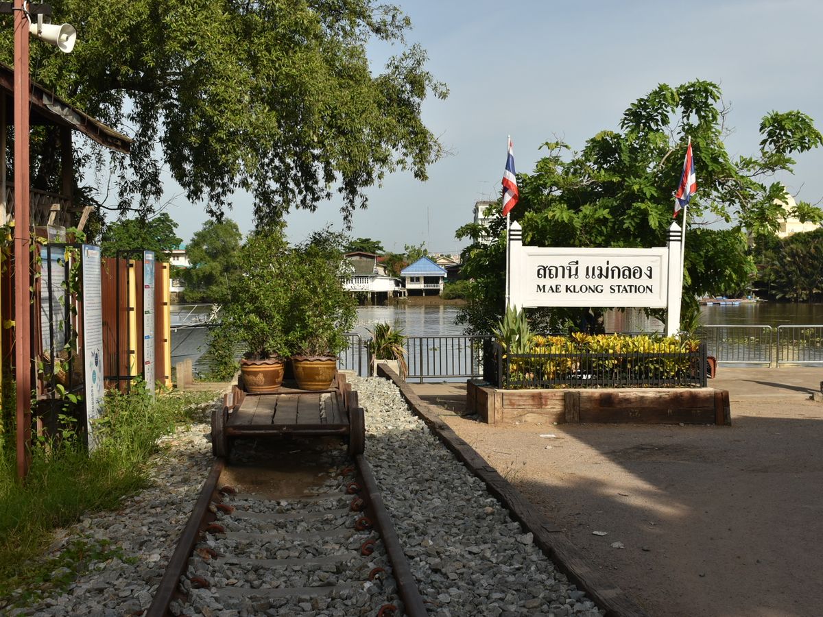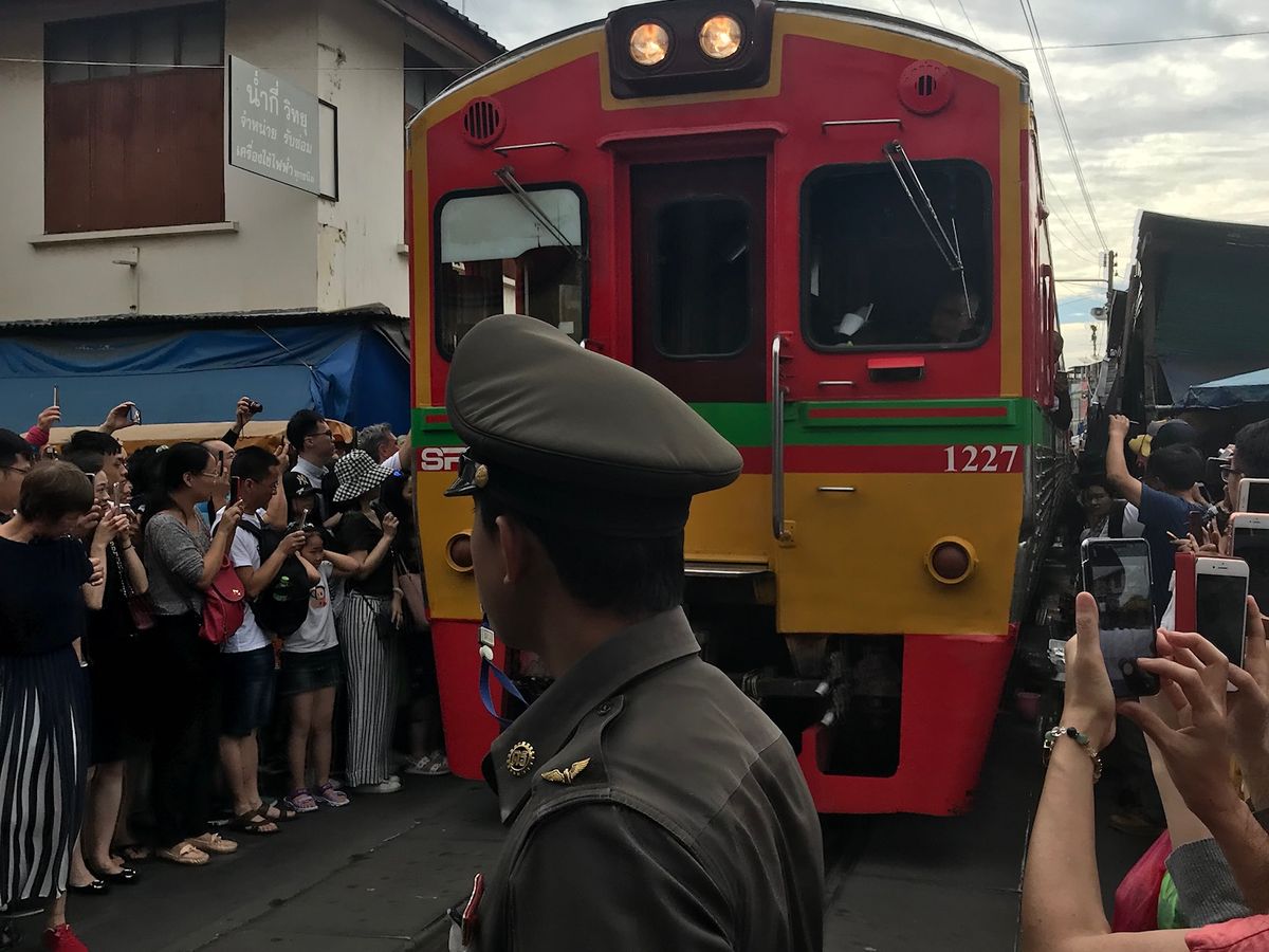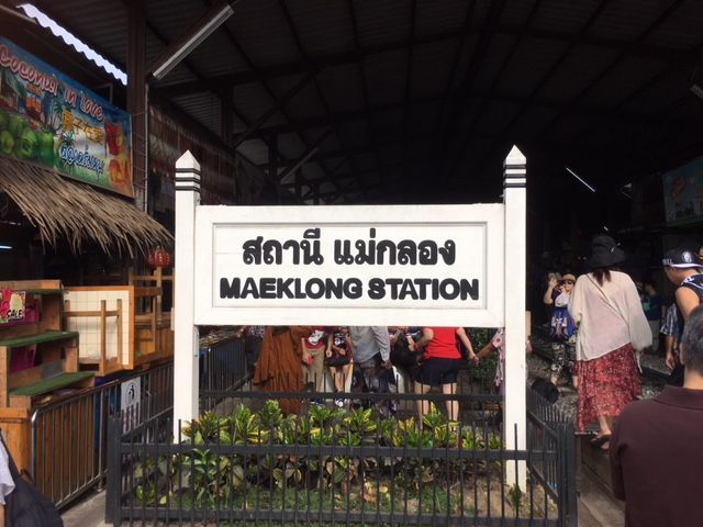 ちょっと早めにメークロン駅へ到着して、すこし線路市場をみた後、駅の中奥側のメークロン川を見ました。そのあとは電車が来るまで待機。電車の時間が近づくと多くの人でごった返しました。屋根をたたむところをすこし見て、すぐに撮影出来そうな場所へ行き待機。それにしてもすごく暑かった。海外の背の高いお姉さん、お兄さんの後ろで大変でしたが、自撮り棒を掲げたらゆっくり入ってくる電車を撮ることが出来ました。