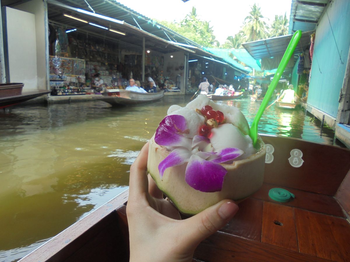 5/8の早朝に空港に到着し(機内泊)そのままホテルに荷物だけ預けて身支度をしツアーに参加しました。ココナッツファーム→水上マーケット→アユタヤのツアーに参加しました(^O^)