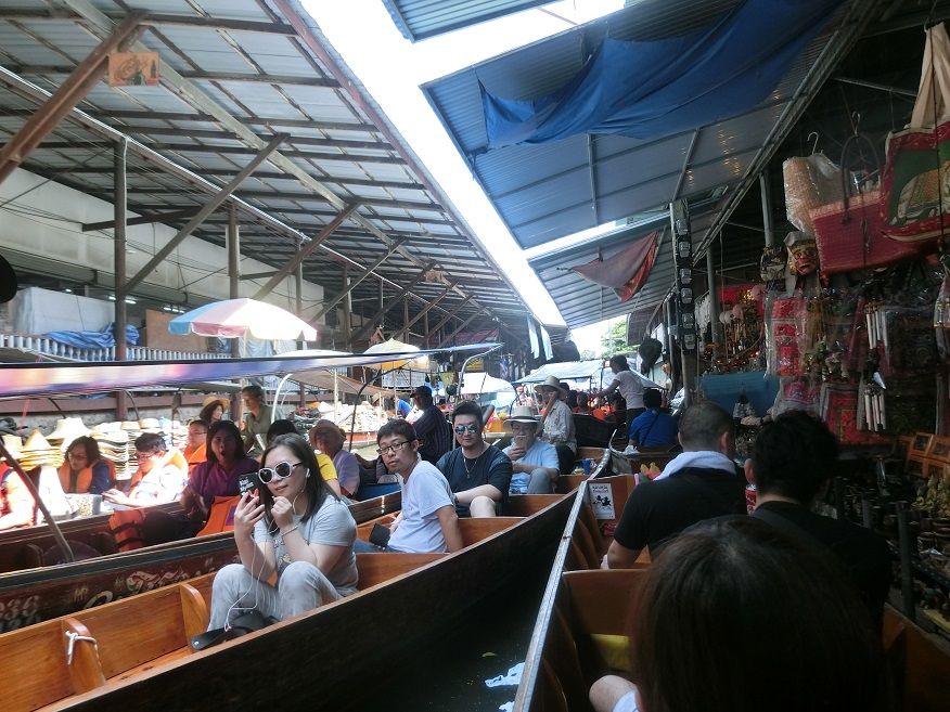 中国人の観光コースに入っているらしく線路市場メークロンも水上マーケットもどちらも大混雑でした。ガイドさんは日本語が堪能でよくしてくれましたが・・・。モーターボートでの水上マーケットまでの移動はなかなかのスピードで爽快でしたが、1人200バーツだして水上マーケットで手漕ぎボートに乗りましたが、船が多すぎで渋滞しまくりでほとんど身動きがとれず。ある意味貴重な体験をしました。