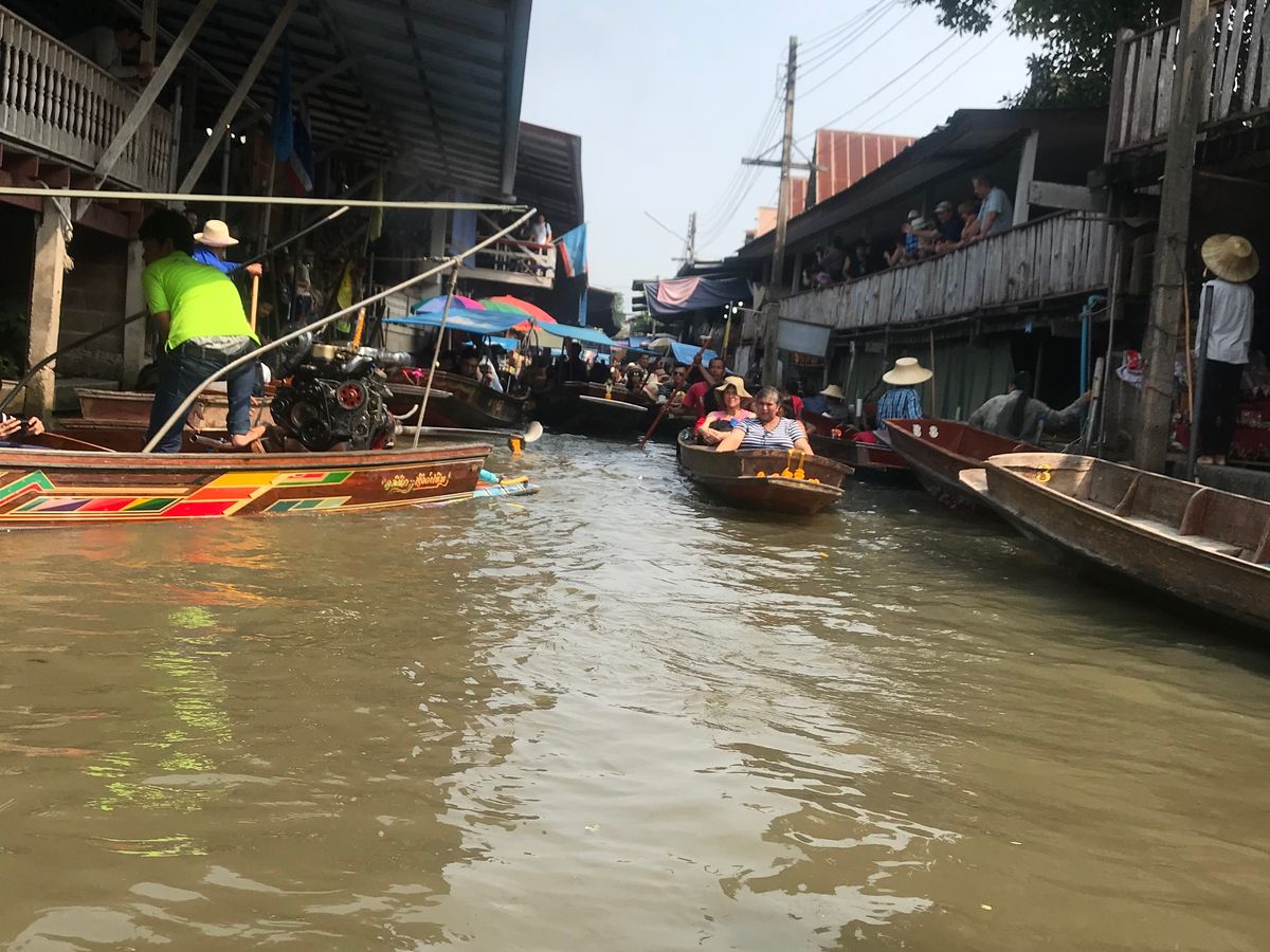 次に水上マーケット。最初ジェットボート?に乗って川を一巡します。これも早い時刻からのスタートだったので、水上渋滞前?ビュンビュン飛ばしてくれての見学になり超スリルあり!遅い時間からのスタートではこうは飛ばせない!参加前の娘はめんどくさそうと嫌々の参加でしたが、ジェットボートに乗っている間は楽しくずっとゲラゲラ笑ってご機嫌でした。暑いこの時期には絶対必須のツアーです。