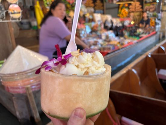水上マーケット:ボードに乗って買い物するなら一人当たり200バーツ追加で支払いました。買い物はすごく楽しかったですが、割高なので注意、のちに行くメークロン市場のほうが安いです。地上にお店もありそちらでも買い物できました。
