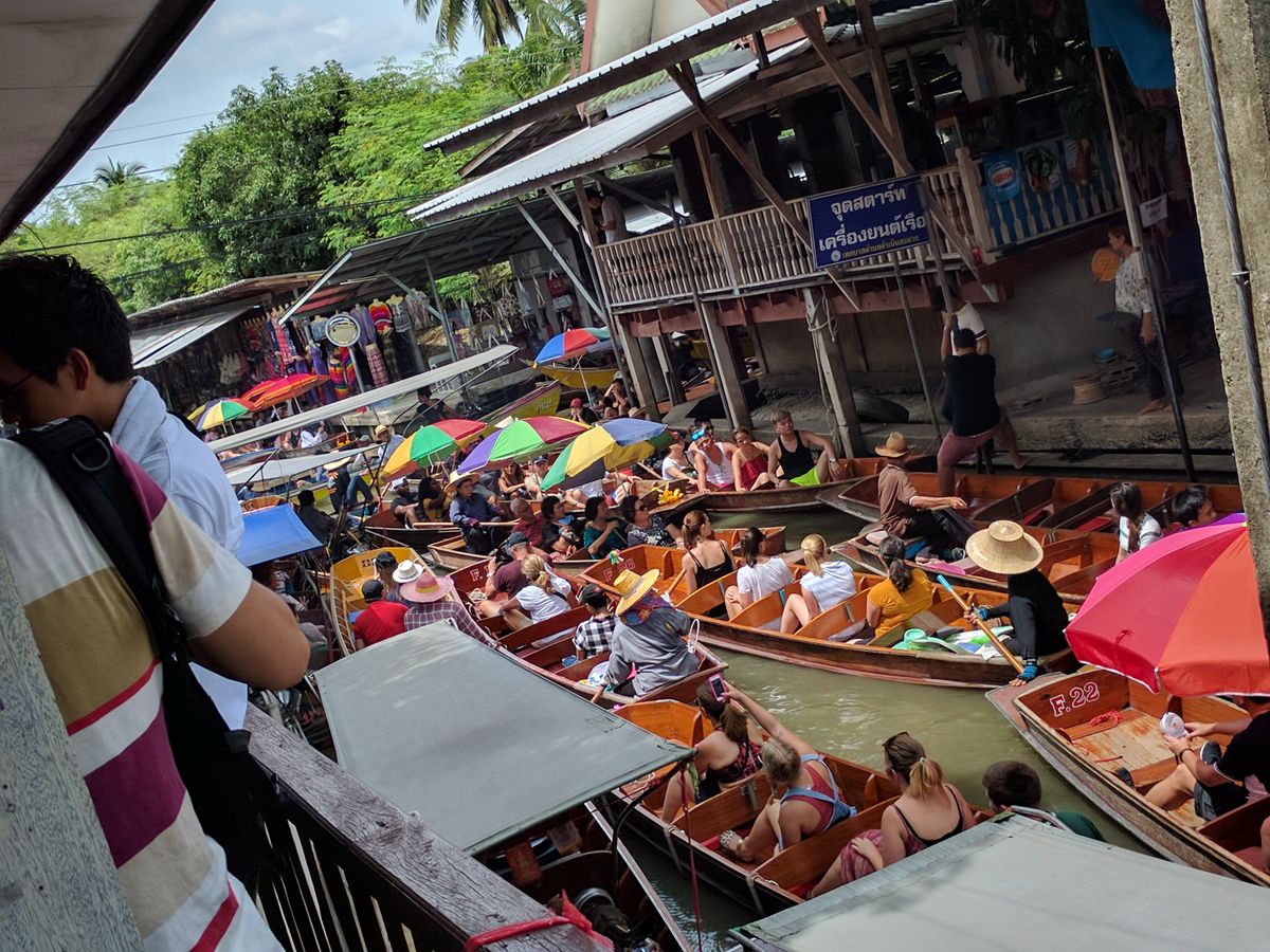 夫婦でのタイ旅行。3日目の朝はなんと6時半出発でしたが、ホテルまで迎えにきてくれたのでなんとか出発できました。迎えに来たガイドさんは女性の方で日本語はあまり得意ではなさそうでしたが一生懸命せつめいしてくれました。社内に乗り込むと水を1本ずつ配ってくれ、2時間ほど移動してメークロンへ。有名な線路市場です。線路の両脇に果物や肉、魚、お菓子などがひしめき合って並ぶ場所。移動は線路上を左右で往路、復路のように一列ずつになって進みます。途中、トイレを借りられる場所があり、5バーツ払って利用。電車が来る時間になるとお店のテントがパタパタとたたまれていくのですが、、、とにかくすごい人(観光客)であまり思うようには見られません。メークロンで電車を見送った後は車の中でガイドさんが買ってくれたランブータンを味見。ライチみたいでおいしかったです。水上マーケットの途中、ココナツシュガーを売るお土産屋さんにてトイレ休憩(無料)ココナツシュガーはコーヒーなどに入れたり、そのままおやつとして食べたりするそうです。優しい味がして美味しかったです。水上マーケットではまず、高速ボート乗り場から水上マーケットまで移動。マーケットの船着き場は手漕ぎボートと高速ボートで大渋滞。ボートに乗って買い物するためには手漕ぎボートに乗らなければなりません。(別途一人200バーツくらい)船着き場が大渋滞でなかなか進まずイライラしましたが、そこを抜ければすいすいと漕ぎ手の女性が操作してくれます。見たいお店がみつかったら漕ぎ手の方に合図して停めてもらい、交渉しながらお買い物。ほかのマーケットで買うより若干高めな印象を受けます(交渉次第ですが)。ボートでのお買い物体験の後はガイドさんが買っておいてくれたザボンという夏ミカンのようなフルーツと揚げバナナで休憩。どちらもとてもおいしかったです。そのあとはお昼のタイラーメンを食べに食堂へ。麺の種類を選ぶとあっという間にもってきてくれます。自分で調味料を入れ、好みの味にして食べました。美味しかったです