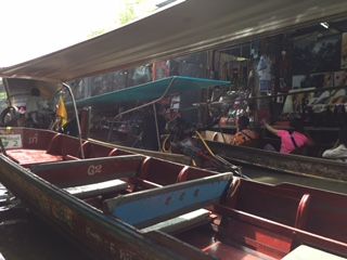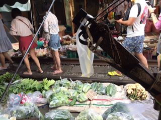 来た キタ 電車がきたよ、世界中から鉄道ファンがまってたよ!パタパタと書割よろしく 天幕が下げられ、今しがた産直野菜が所せましと並んでいた売台がスルスルと引かれた。そして 何事もなかったかのような顔つきで 電車がきたよ!2幕物の舞台を見ているようだ。そして其のあと 私たちを乗せて 水しぶきも爽快にボートは水上マーケットを目指しました。両脇に水上生活者が手を振ってくれ、鼻で木材を運搬中の象が熱帯雨林に見え隠れし モンキーバナナが手を伸ばせばもげるほど近い。水にたゆとうと人は柔和になる。マーケットの各店を流して 笑顔を交換し 世界各国からの旅行者が風情を楽しんでいる。気分が爽快だ、顔が柔らかい、タイに癒されている自分を感じた!!